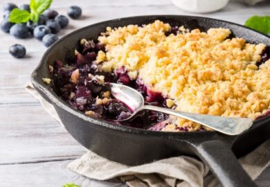 Recept: Vegan appel-blauwe bessencrumble met chocola