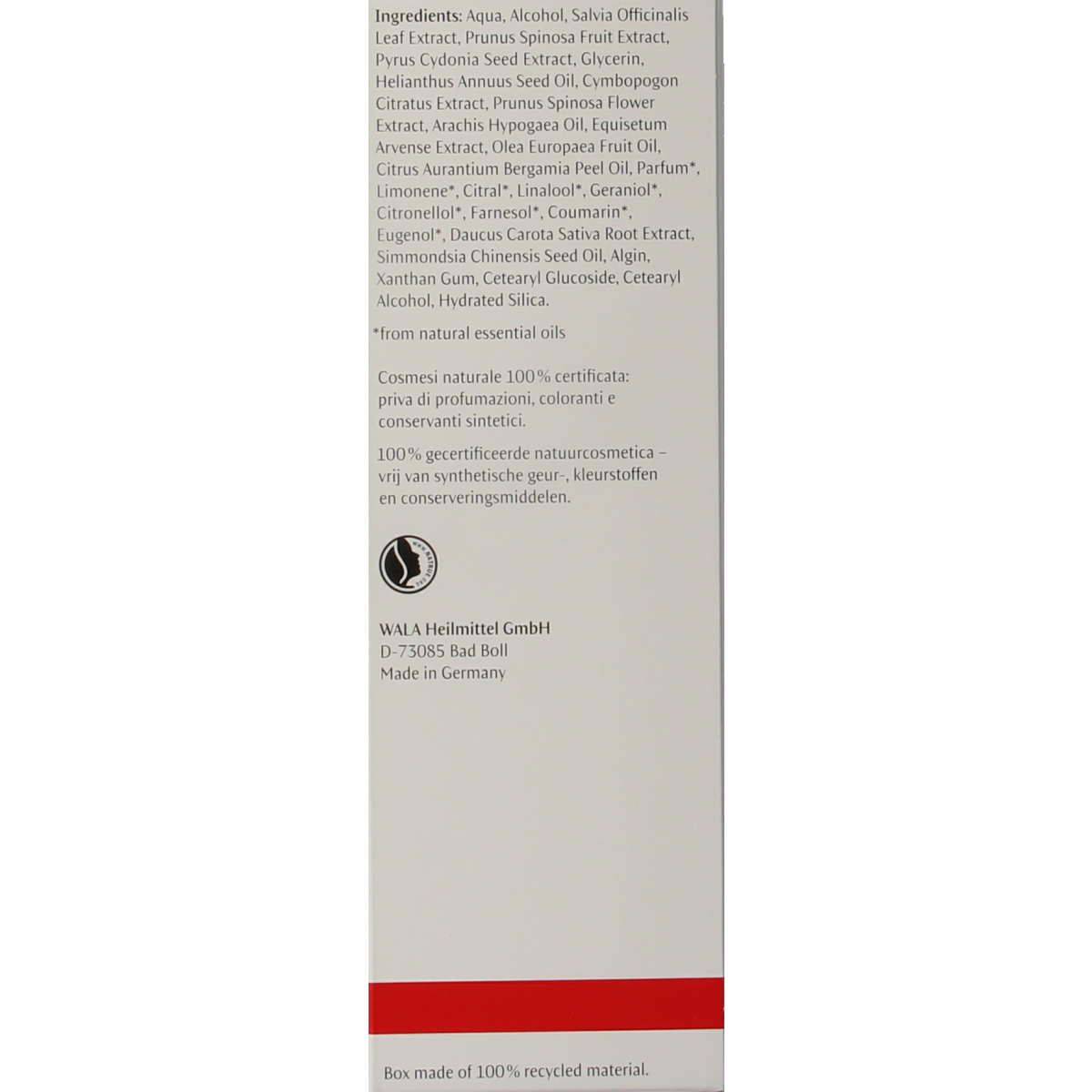 Aqua, Alcohol, Salvia Officinalis Leaf Extract, Prunus Spinosa Fruit Extract, Pyrus Cydonia Seed Extract, Glycerin, Helianthus Annuus Seed Oil, Cymbopogon Citratus Extract, Prunus Spinosa Flower Extract, Arachis Hypogaea Oil, Equisetum Arvense Extract, Olea Europaea Fruit Oil, Citrus Aurantium Bergamia Peel Oil, Parfum*, Limonene*, Citral*, Linalool*, Geraniol*, Citronellol*, Farnesol*, Coumarin*, Eugenol*, Daucus Carota Sativa Root Extract, Simmondsia Chinensis Seed Oil, Algin, Xanthan Gum, Cetearyl Glucoside, Cetearyl Alcohol, Hydrated Silica.