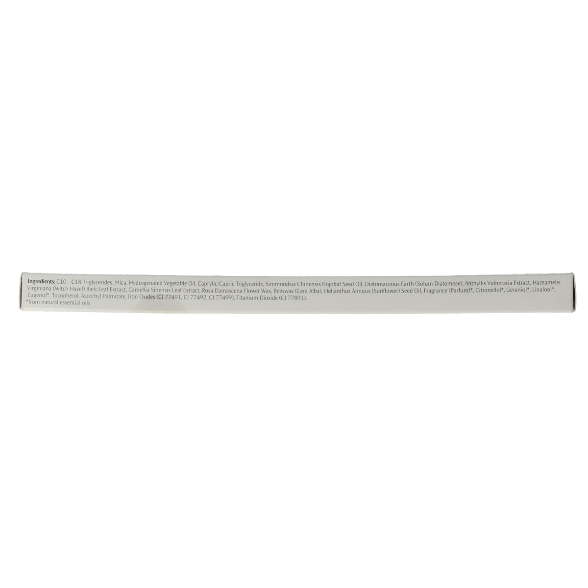 C10-C18 Triglycerides, Mica, Hydrogenated Vegetable Oil, Caprylic/Capric Triglyceride, Simmondsia Chinensis (Jojoba) Seed Oil, Diatomaceous Earth (Solum Diatomeae), Anthyllis Vulneraria Extract, Hamamelis Virginiana (Witch Hazel) Bark/Leaf Extract, Camellia Sinensis Leaf Extract, Rosa Damascena Flower Wax, Beeswax (Cera Alba), Helianthus Annuus (Sunflower) Seed Oil, Fragrance (Parfum)*, Citronellol*, Geraniol*, Linalool*, Eugenol*, Tocopherol, Ascorbyl Palmitate, Iron Oxides (CI 77491, CI 77492, CI 77499), Titanium Dioxide (CI 77891).