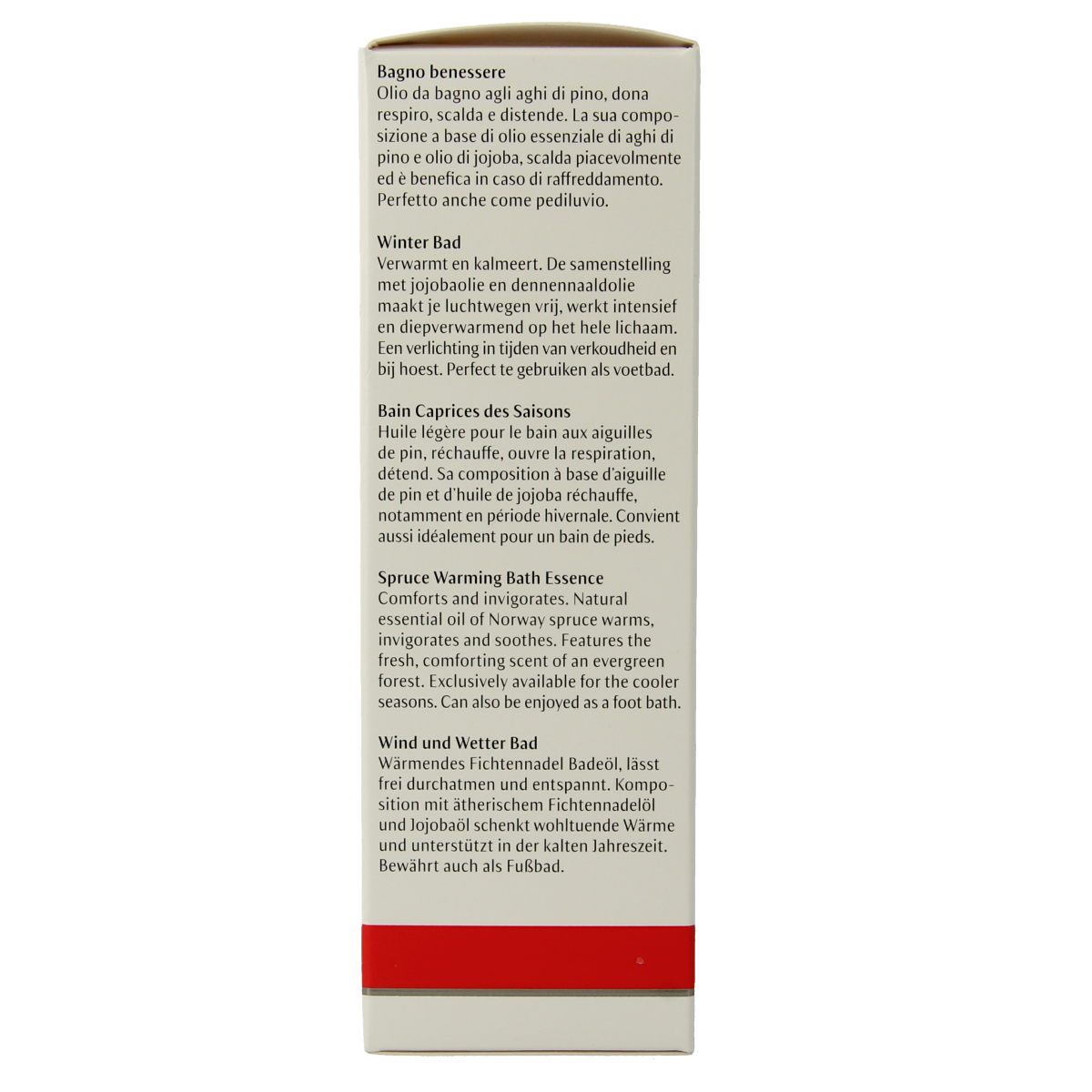 Het kruidig geurende Winter Bad schenkt weldadige rust, ontspanning en warmte. Vooral in het koude jaargetijde is etherische dennennaaldolie van onschatbare waarde. De badolie ondersteunt de doorbloeding van de huid, werkt intensief en diepverwarmend op het hele lichaam. De harsachtige dennennaaldengeur ontspant en laat je vrij ademen. Jojobaolie zorgt voor een zachte huid. Deze badolie heeft een weldadig effect tijdens koude, gure dagen. Pure verwennerij, ook als voetbad.