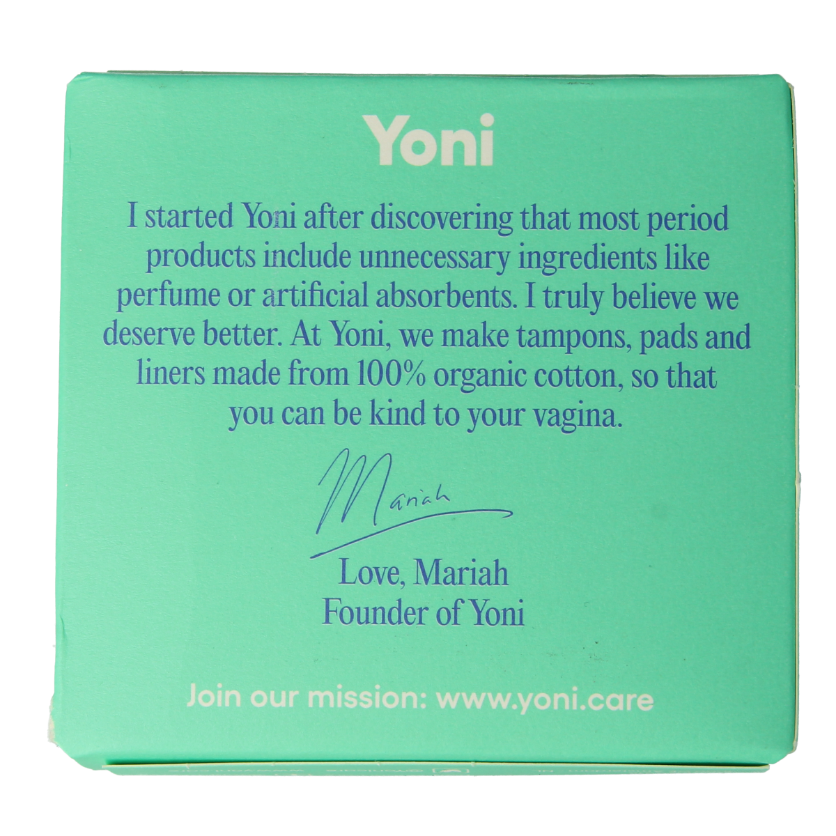 Yoni vindt dat iedere vrouw zou moeten weten waar haar producten van gemaakt zijn. Daarom staat het bij Yoni gewoon op het doosje. Yoni kiest voor biologisch katoen. Verder niets. Geen plastic, geen parfum, geen geheimen.