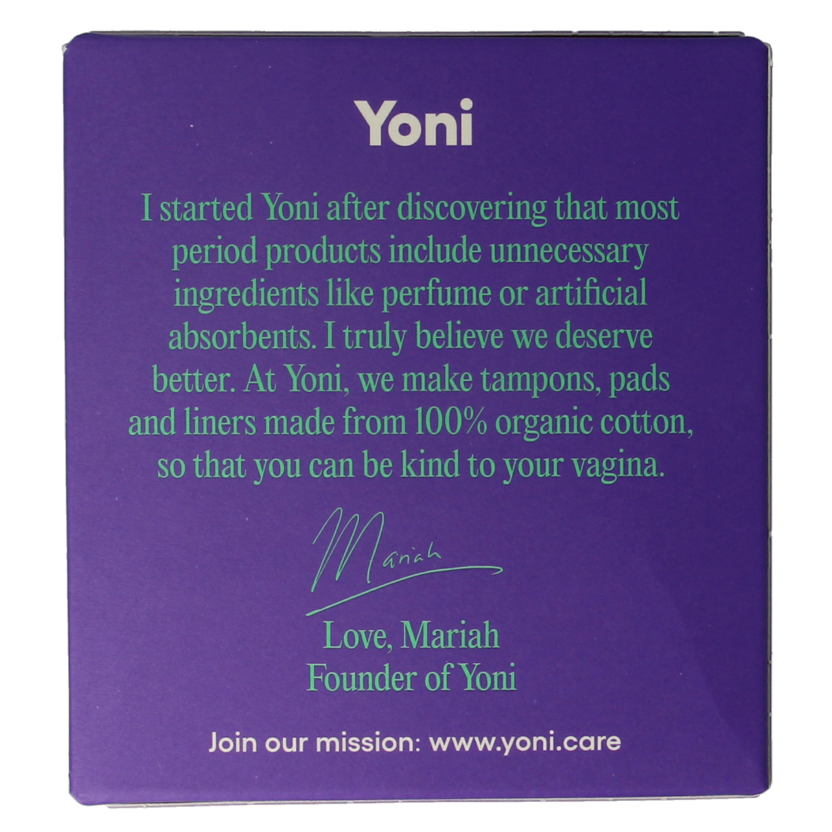 Yoni vindt dat iedere vrouw zou moeten weten waar haar producten van gemaakt zijn. Daarom staat het bij Yoni gewoon op het doosje. Yoni kiest voor biologisch katoen. Verder niets. Geen plastic, geen parfum, geen geheimen.
