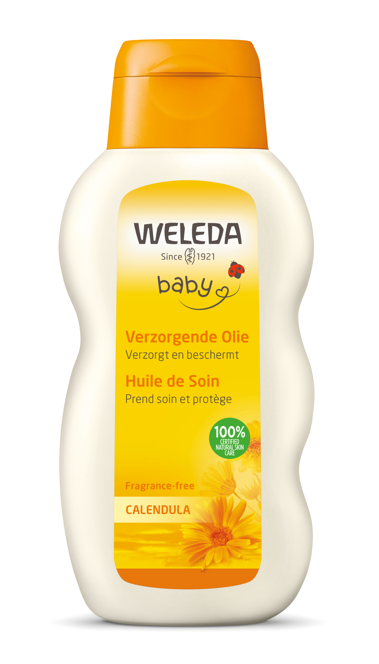 Calendula Verzorgende Babyolie is een intensief verzorgende en verwarmende huidolie die geschikt voor de dagelijkse verzorging van je baby. Daarnaast kan je deze babyolie gebruiken voor een ontspannende babymassage. Biologische sesamolie houdt de huid zacht en soepel en beschermt tegen uitdrogen. Extract van Calendula werkt zuiverend en verzachtend voor de huid. De olie is parfumvrij en daardoor ook geschikt voor de zeer gevoelige babyhuid.