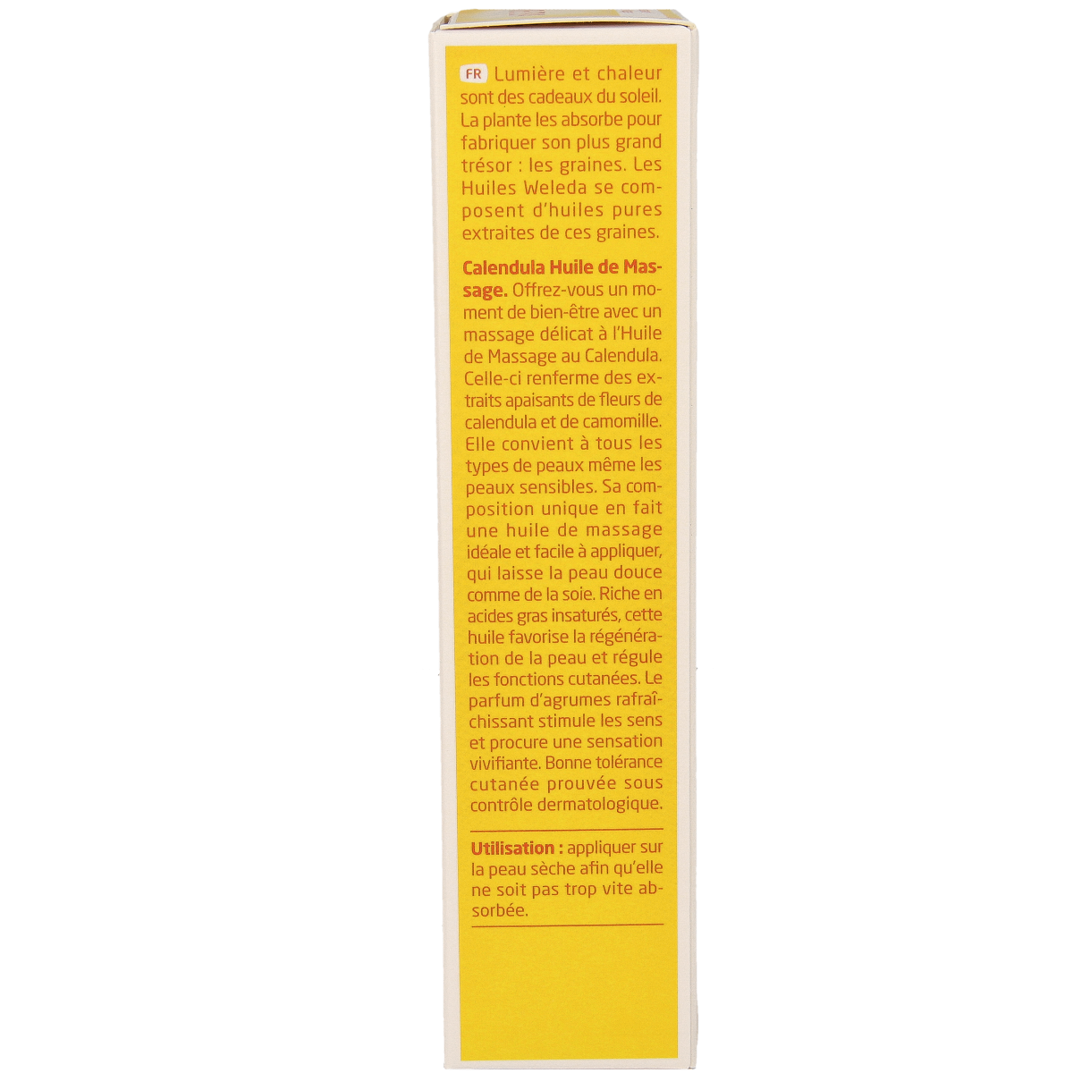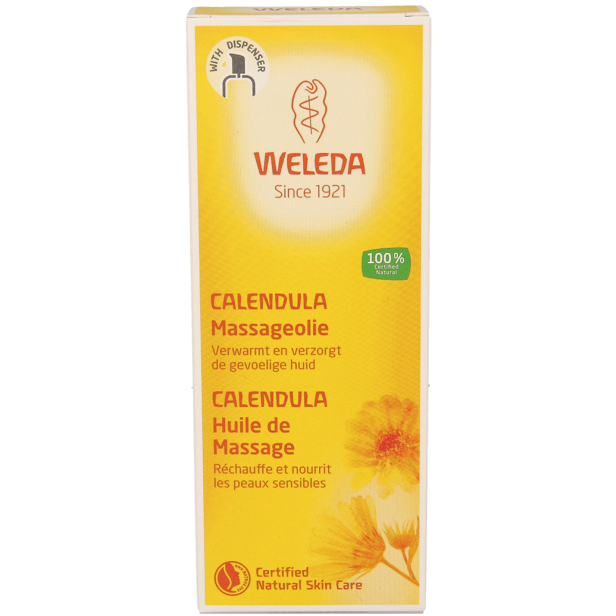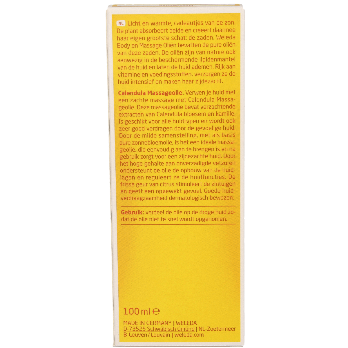 Calendula Massageolie is speciaal ontwikkeld voor de verzorging van de gevoelige huid. Deze licht geurende olie is veelzijdig te gebruiken: bij een ontspannende massage, om te verwarmen of voor de verzorging van een ruwe of licht geprikkelde huid. Biologische Calendula en kamille verzachten en kalmeren de huid.