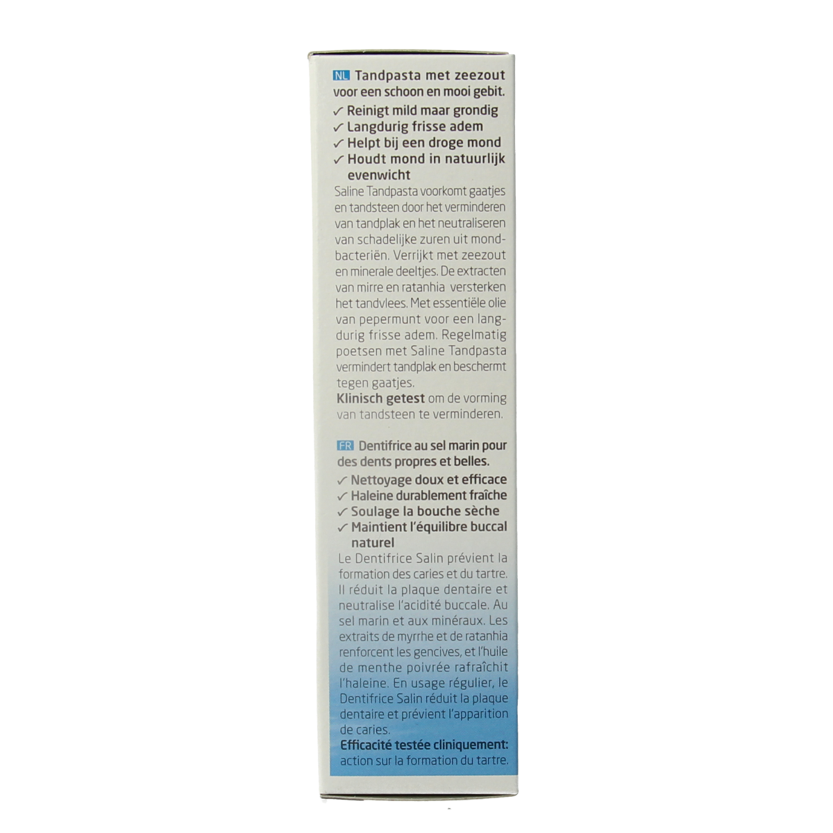 Saline Tandpasta gaat de vorming van tandplak tegen en vormt een natuurlijke bescherming tegen tandsteen. Zeezout heeft een drievoudige werking in de mond. Het stimuleert de zelfreinigende werking van het speeksel, neutraliseert het zuurgehalte in de mond en versterkt het tandvlees. Let op: Dit product bevat pepermuntolie. Om deze reden raden wij af om dit product te gebruiken in combinatie met homeopathische middelen.