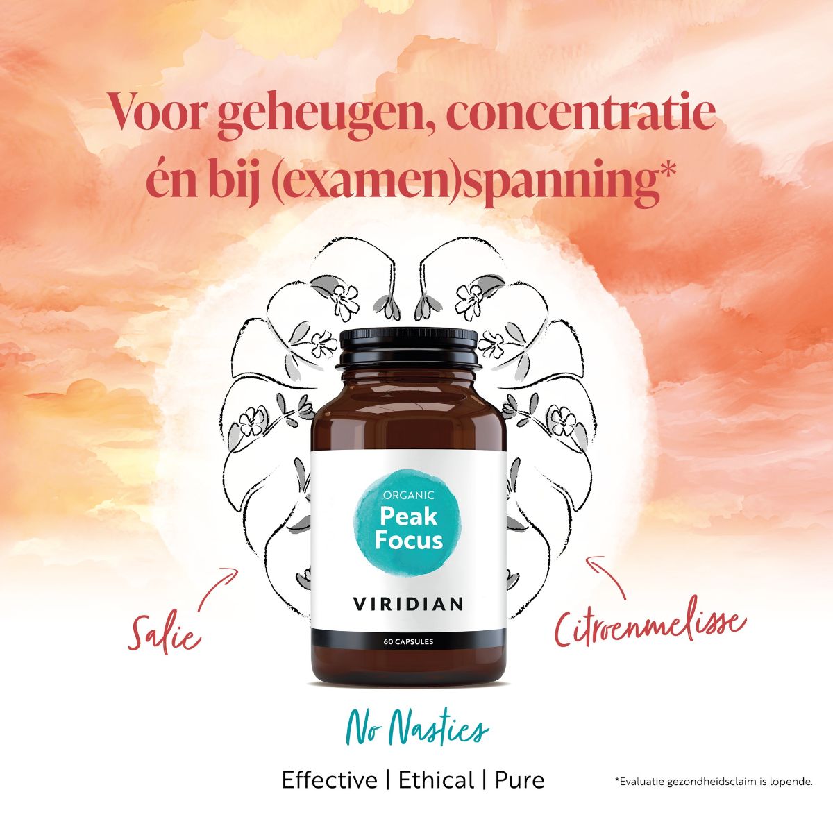 De kwaliteit van Peak Focus schuilt niet alleen in de kruiden zelf, maar ook in de manier waarop deze zijn verwerkt. Viridian werkt met zorgvuldig ontwikkelde, onderzochte en gepatenteerde formules met gestandaardiseerde extracten: Cognivia™ voor salie en Bluenesse® voor citroenmelisse.