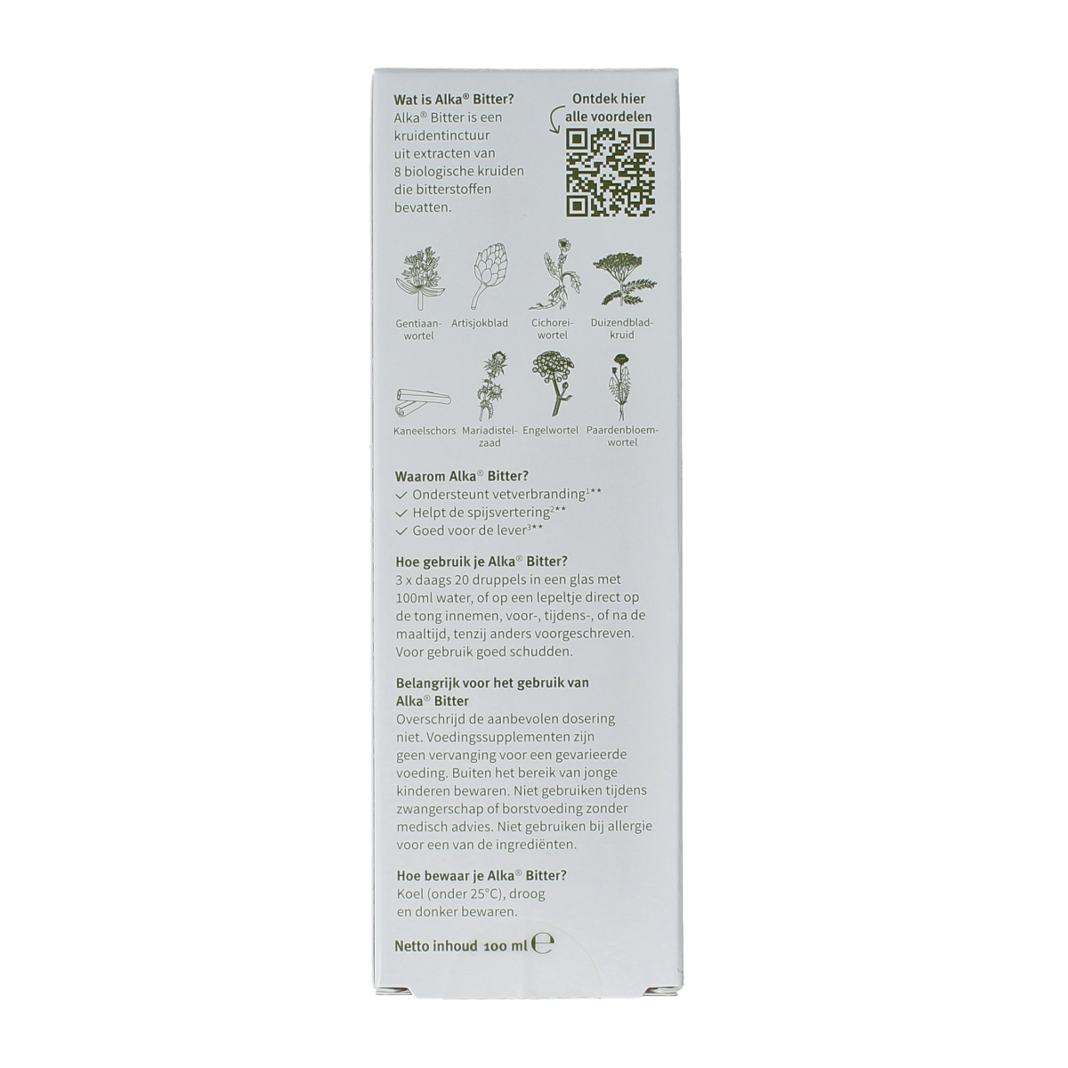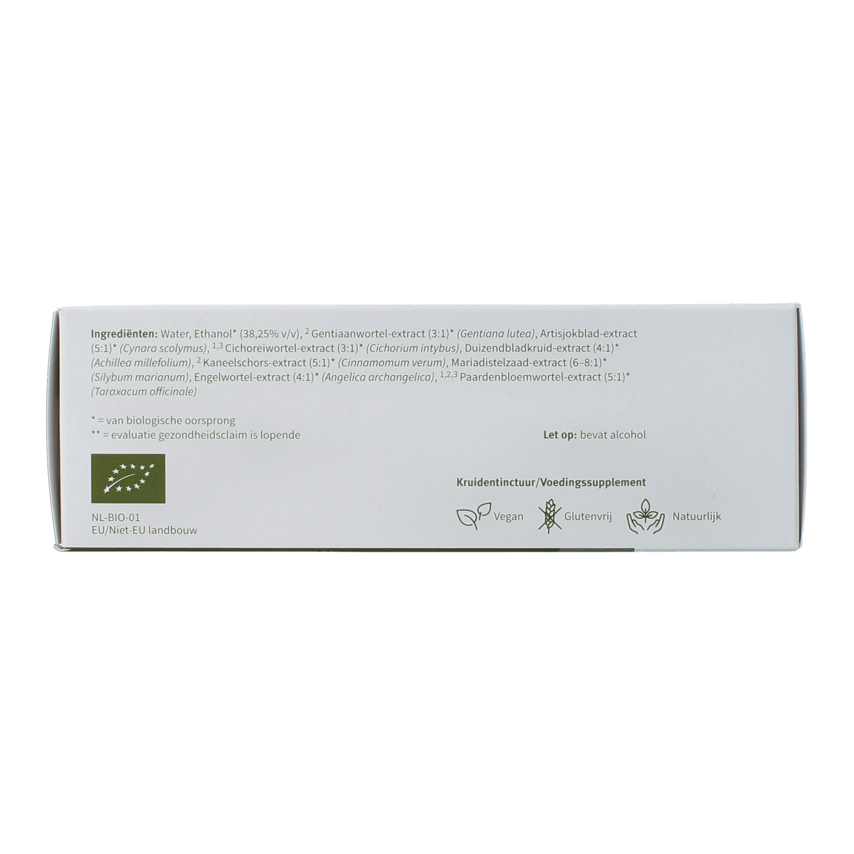 Water, Ethanol* (38,25% v/v), Gentiaanwortel-extract (3:1)* (Gentiana lutea), Artisjokblad-extract (5:1)* (Cynara scolymus), Cichoreiwortel-extract (3:1)* (Cichorium intybus), Duizendbladkruid-extract (4:1)* (Achillea millefolium), Kaneelschors-extract (5:1)* (Cinnamomum verum), Mariadistelzaad-extract (6–8:1)* (Silybum marianum), Engelwortel-extract (4:1)* (Angelica archangelica), Paardenbloemwortel-extract (5:1)* (Taraxacum officinale).* = van biologische oorsprong