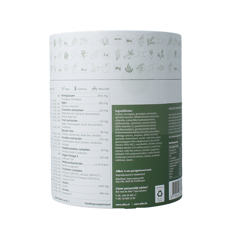 Kiemgrassen & Algenextracten: Tarwegras (Triticum vulgare), Gerstegras (Hordeum vulgare), Alfalfa (Medicago sativa L.), Spirulina (Spirulina platensis), Chlorella (Chlorella vulgaris), Fruits & Greens™: Paprika (Capsicum annuum), Gember (Zingiber officiale), Broccoli (Brassica oleracea), Spinazie (Spinacia oleracea), Boerenkool (Brassica oleracea), Kool (Brassica oleracea), Groene thee (Cammellia sinensis), Framboos (Rubus idaeus), Banaan (Max paradisiacal), Kiwi (Actinidia), Mango (Magnifera indica), Pruim (Prunus domestica), Veenbes (Vaccinium macrocarpon), Ananas (Ananas comosus), Sinaasappel (Citrus sinensis), Roze grapefruit (Citrus paradisis), Kers (Prunus avium), Citroen (Citrus limon), Bloemkool (Brassica oleracea), Tarwegras (Triticum vulgare), Alfalfa (Medicago sativa), Spirulina (Spirulina platensis), Chlorella (Chlorella vulgaris), Solidago (Solidago virgaurea), Groene Thee (Cammellia sinensis), Gember (Zingiber officiale), Kurkuma (Curcuma Longa), Lactobacillus (Bacillus coagulans), Digezyme® (Amylase, Lactase, Cellulase, Protease, Lipase), Arabische gom (Acacia senegal), Appelvezels, Panmol® natuurlijk vit. B complex uit Quinoa (Chenopodium quinoa), Acerola (Malpighia glabra) (waarvan 50 % natuurlijke Vitamine C), Zink gluconaat, Stabilisators (arabische gom, maltodextrine, maiszetmeel), natuurlijke aroma (woudvruchten, vanille), zuurteregelaar (citroenzuur), zoetstof (steviolglycoside)