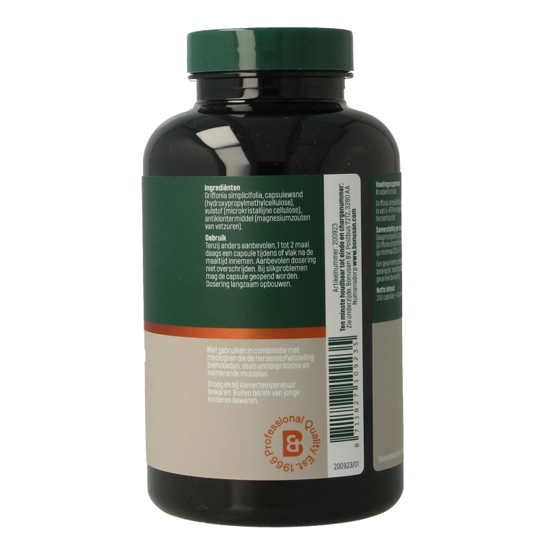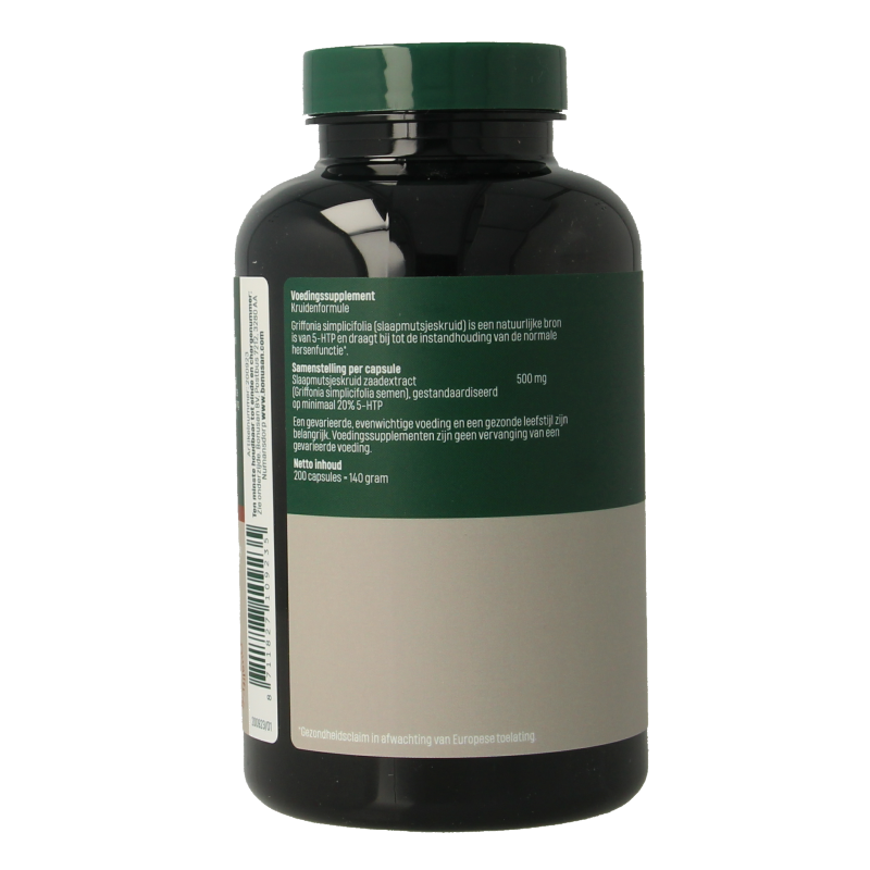 – Gestandaardiseerd op 20% 5-HTP, dus 100 mg 5-HTP per capsule
