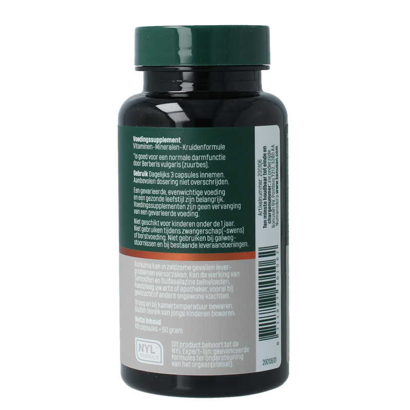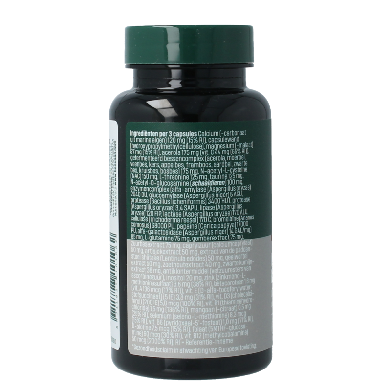 Capsulewand (hydroxypropylmethylcellulose), mineralencomplex uit kalkhoudende marine algen (Lithothamnium calcareum), magnesiummalaat, gefermenteerd bessencomplex (acerola (Malpighia glabra), moerbei (Morus alba), veenbes (Vaccinium macrocarpon), kers (Prunus avium), appelbes (Aronia melanocarpa), framboos (Rubus idaeus), aardbei (Fragaria ananassa), zwarte bes (Ribes nigrum), kruisbes (Ribes uva-crispa), bosbes (Vaccinium myrtillus)), Malpighia emarginata, N-acetyl-L-cysteïne, L-threonine, taurine, N-acetyl-D-glucosamine (SCHAALDIEREN), enzymencomplex, L-glutamine, Berberis vulgaris, Zingiber officinale, calciumcaprylaat, Curcuma longa, Cynara scolymus, extract van de paddenstoel shiitake (Lentinula edodes), Glycyrrhiza glabra, Nigella sativa, antiklontermiddel (vetzuuresters van ascorbinezuur), inositol, zinkmono-L-methioninesulfaat, bètacaroteen, D-alfa-tocoferylwaterstofsuccinaat, cholecalciferol, thiaminehydrochloride, mangaancitraat, seleno-L-methionine, pyridoxaal-5″-fosfaat, D-biotine, (6S)-5-methyltetrahydrofoliumzuur/glucosaminezout, methylcobalamine.