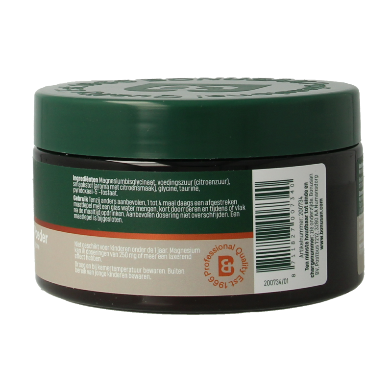 Magnesan Forte plus poeder is al ruim 20 jaar een van de populairste Bonusan producten onder gezondheidsprofessionals. Eén maatschepje Magnesan Forte plus levert 111 mg elementair magnesium. Elementair betekent dat je lichaam deze 111 mg volledig kan gebruiken. Bovendien bevat het product uitsluitend zeer goed opneembaar bisglycinaat en is het volledig vrij van moeilijk opneembaar magnesiumoxide. De hoge kwaliteit magnesium is aangevuld met de belangrijke cofactoren vitamine B6, L-glycine en taurine. Zoals je van ons gewend bent bevat dit product geen onnodige toevoegingen zoals kunstmatige kleur-, geur- en smaakstoffen.