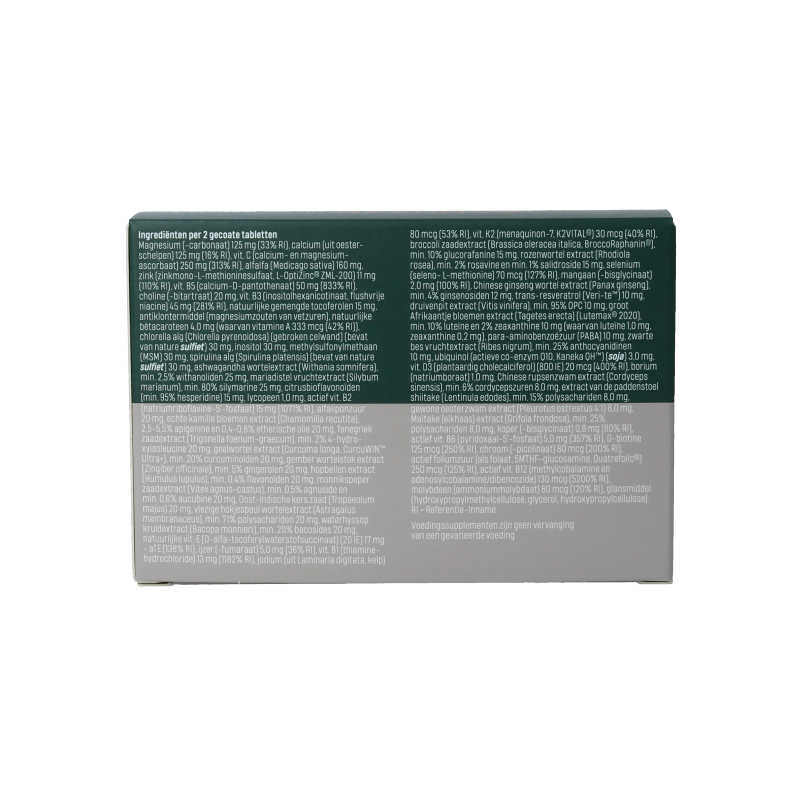 Magnesiumcarbonaat, oesterschelpgranulaat, Medicago sativa, calciumascorbaat, magnesiumascorbaat, zinkmono-L-methioninesulfaat, calcium-D-pantothenaat, cholinebitartraat, inositolhexanicotinaat, natuurlijke gemengde tocoferolen, antiklontermiddel (magnesiumzouten van vetzuren), bètacaroteen, Chlorella pyrenoidosa (bevat van nature SULFIET), inositol, methylsulfonylmethaan, Spirulina platensis (bevat van nature SULFIET), Silybum marianum, Withania somnifera, citrusbioflavonoïden, Lycopersicum esculentum, natriumriboflavine-5’-fosfaat, alfaliponzuur, Astragalus membranaceus, Bacopa monnieri, Chamomilla recutita, Curcuma longa, Humulus lupulus, Trigonella foenum-graecum, Tropaeolum majus, Vitex agnus-castus, Zingiber officinale, D-alfa-tocoferylwaterstofsuccinaat, ijzerfumaraat, thiaminehydrochloride, Laminaria digitata (kelp), menaquinon-7, Brassica oleracea italica, Rhodiola rosea, seleno-L-methionine, mangaanbisglycinaat, Panax ginseng, resveratrol, para-aminobenzoëzuur, Ribes nigrum, Tagetes erecta, Vitis vinifera, ubiquinol (SOJA), cholecalciferol, natriumboraat, Cordyceps sinensis, extract van de paddenstoel shiitake (Lentinula edodes), Grifola frondosa, Pleurotus ostreatus, koperlysinaat, pyridoxaal-5″-fosfaat, D-biotine, chroompicolinaat, (6S)-5-methyltetrahydrofoliumzuur/glucosaminezout, ammoniummolybdaat, adenosylcobalamine, methylcobalamine, glansmiddel (hydroxypropylmethylcellulose), MCT-olie.