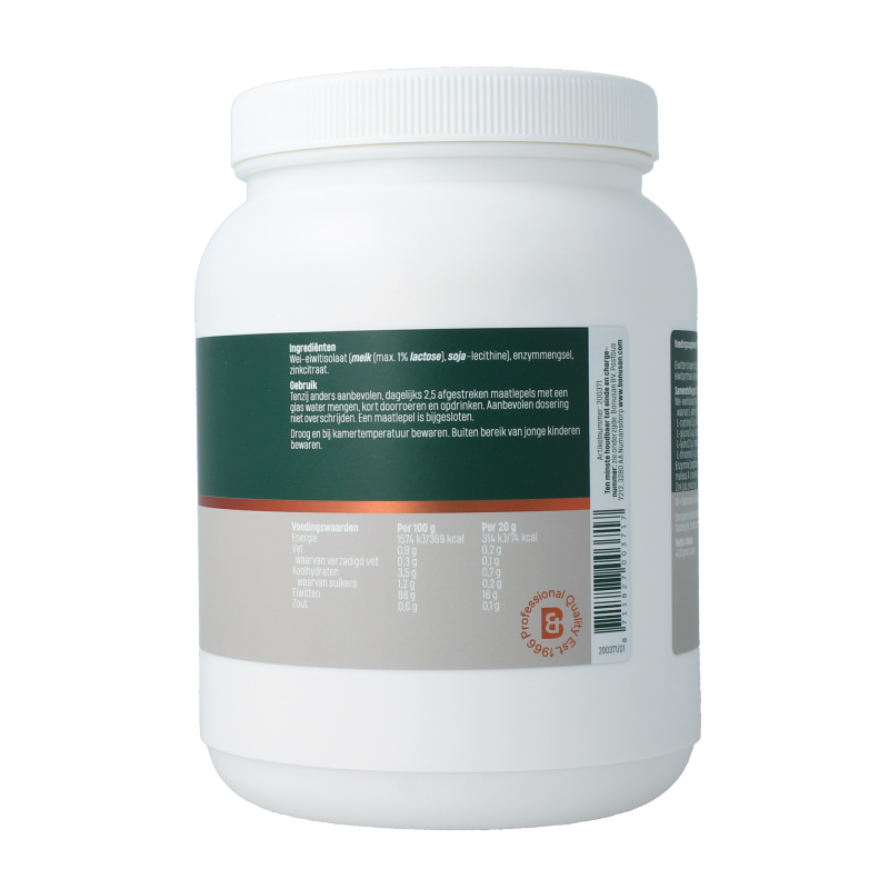Wei-eiwitisolaat (MELK (max. 1% LACTOSE), SOJA-lecithine), enzymmengsel, zinkcitraat.