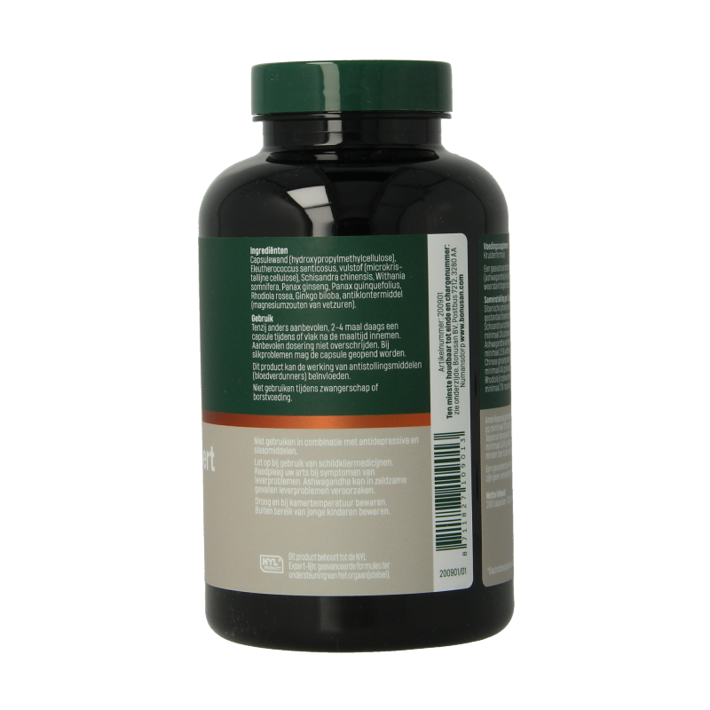 Siberische ginseng (Eleutherococcus senticosus), capsulewand (hydroxypropylmethylcellulose), vulstof (microkristallijne cellulose (cellulosegel)), schisandra (Schisandra chinensis), ashwagandha (Withania somnifera), Chinese ginseng (Panax ginseng), Amerikaanse ginseng (Panax quinquefolius), rozenwortel (Rhodiola rosea), Japanse tempelboom (Ginkgo biloba), antiklontermiddel (magnesiumzouten van vetzuren).