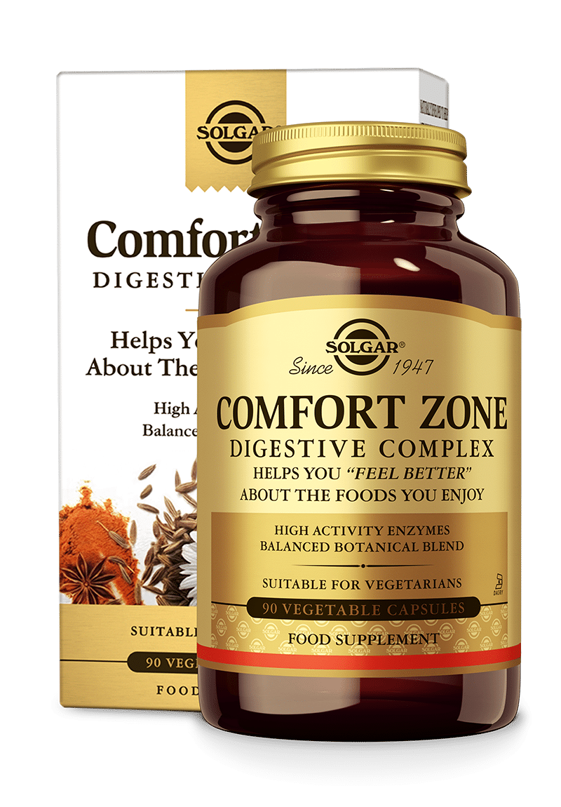 Solgar Comfort Zone Digestive Complex bevat lichaamseigen enzymen en een kruidenmengsel, die de spijsvertering ondersteunen.