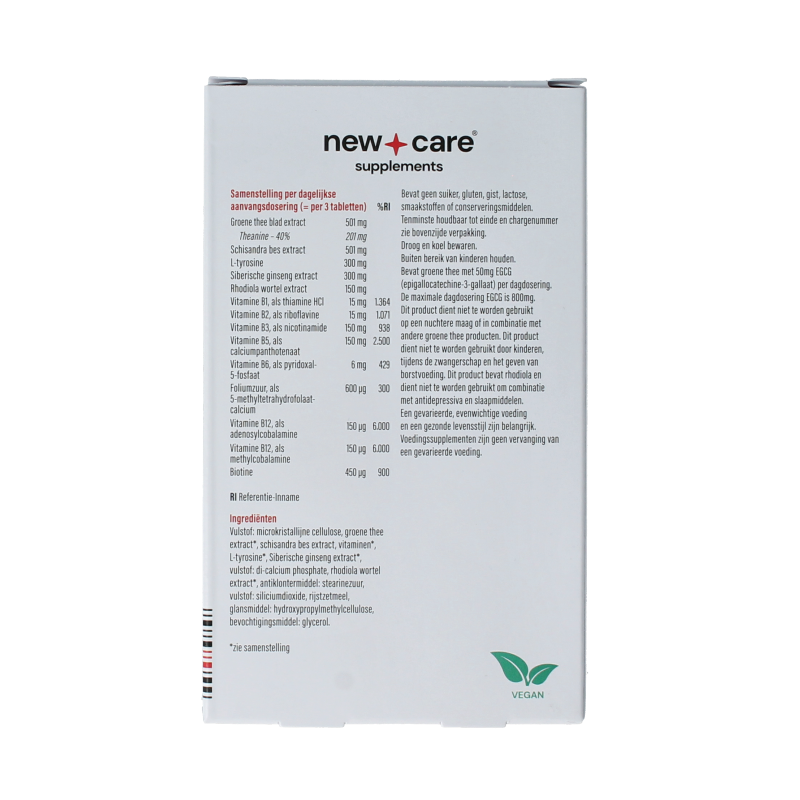Vulstof: microkristallijne cellulose, groene thee extract, schisandra bes extract, vitaminen, L-tyrosine, Siberische ginseng extract, vulstof: di-calcium phosphate, rhodiola wortel extract, antiklontermiddel: stearinezuur, vulstof: siliciumdioxide, rijstzetmeel, glansmiddel: hydroxypropylmethylcellulose, bevochtigingsmiddel: glycerol.