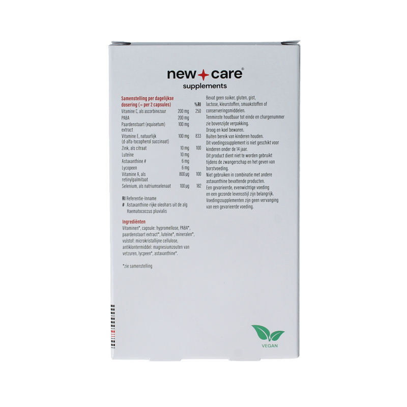 Vitaminen, capsule: hypromellose, PABA, paardenstaart extract, luteïne, mineralen, vulstof: microkristallijne cellulose, antiklontermiddel: magnesiumzouten van vetzuren, lycpeen, astaxanthine.