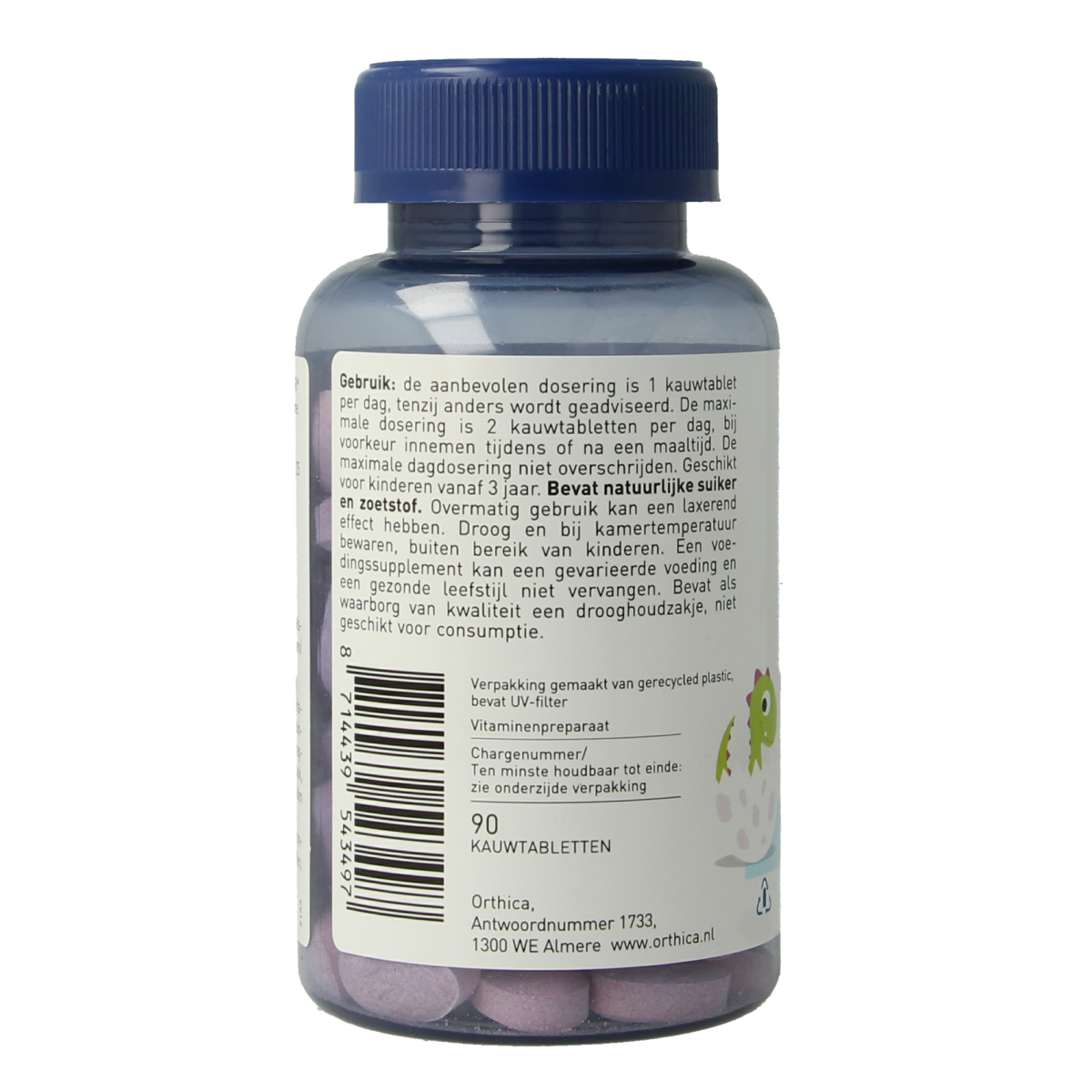 De aanbevolen dosering is 1 kauwtablet per dag, tenzij anders geadviseerd. De maximale dosering is 2 kauwtabletten per dag, bij voorkeur innemen tijdens of na een maaltijd. Geschikt voor kinderen vanaf 3 jaar. Bevat natuurlijke suiker en zoetstof. Overmatig gebruik kan een laxerend effect hebben.