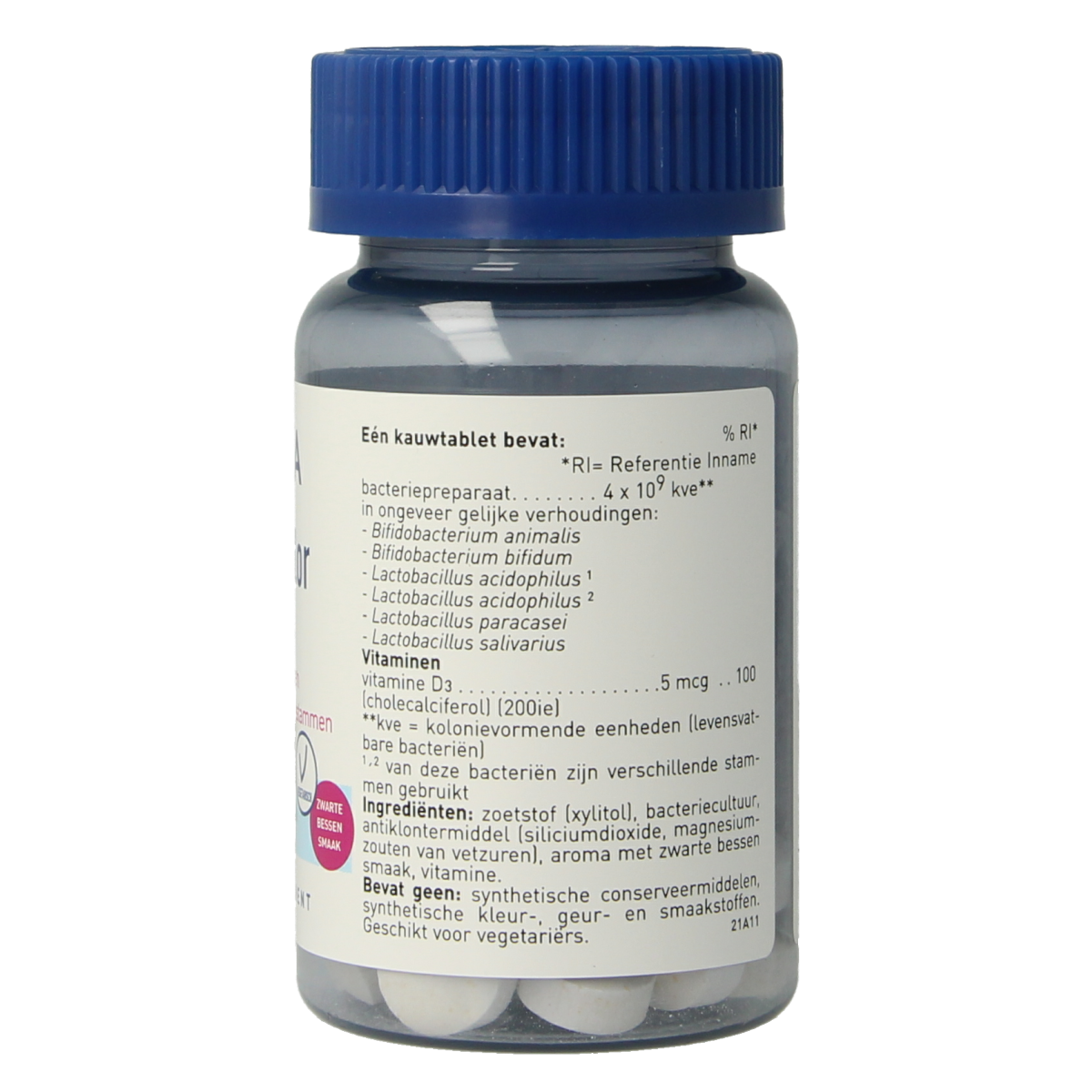 Zoetstof (xylitol), bacteriecultuur, antiklontermiddel (siliciumdioxide, magnesiumzouten van vetzuren), aroma met zwarte bessen smaak, vitamine.