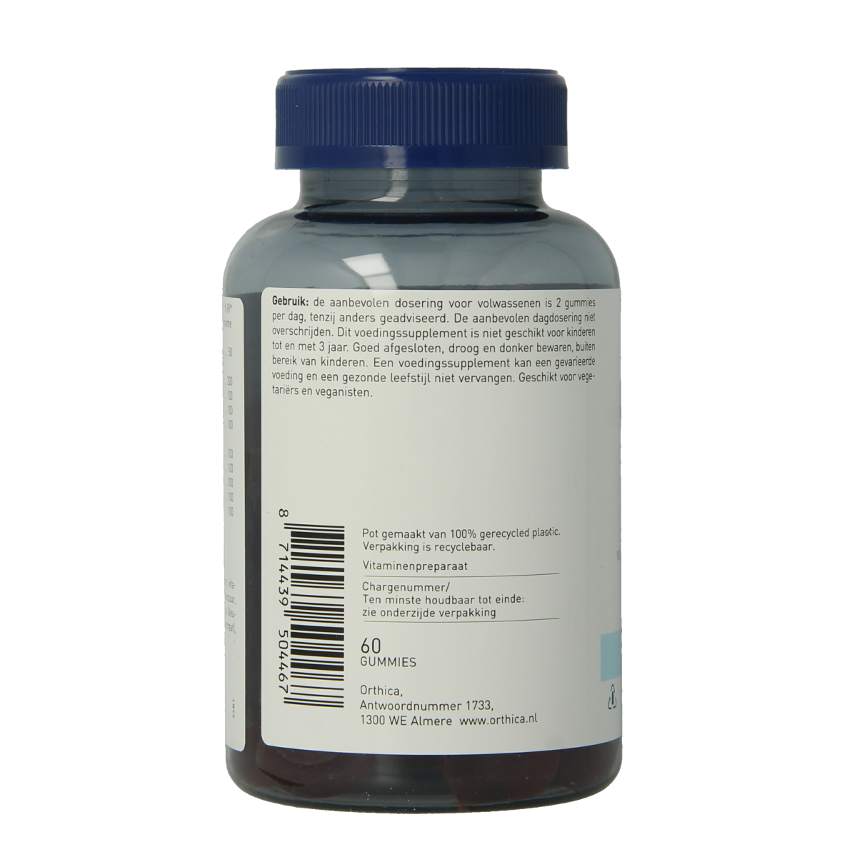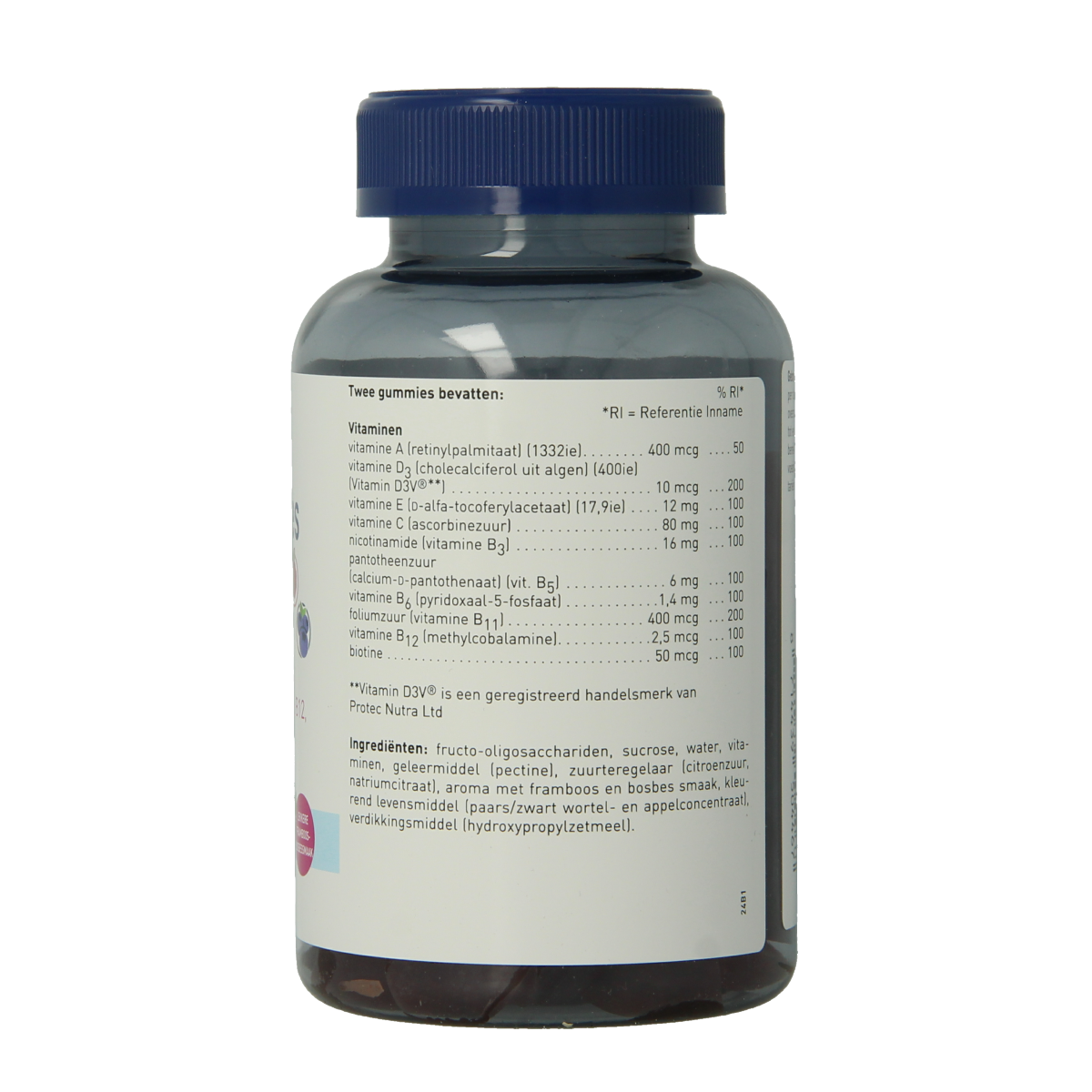 Met hoge doseringen van vitamine A, B3, B5, B6, B12, C, D, E, foliumzuur en biotine. Er is geen gebruik gemaakt van gelatine en de gebruikte vitamine D3 is uit algen onttrokken. Hiermee is deze gummie vegan. In lekkere framboos-bosbes smaak.