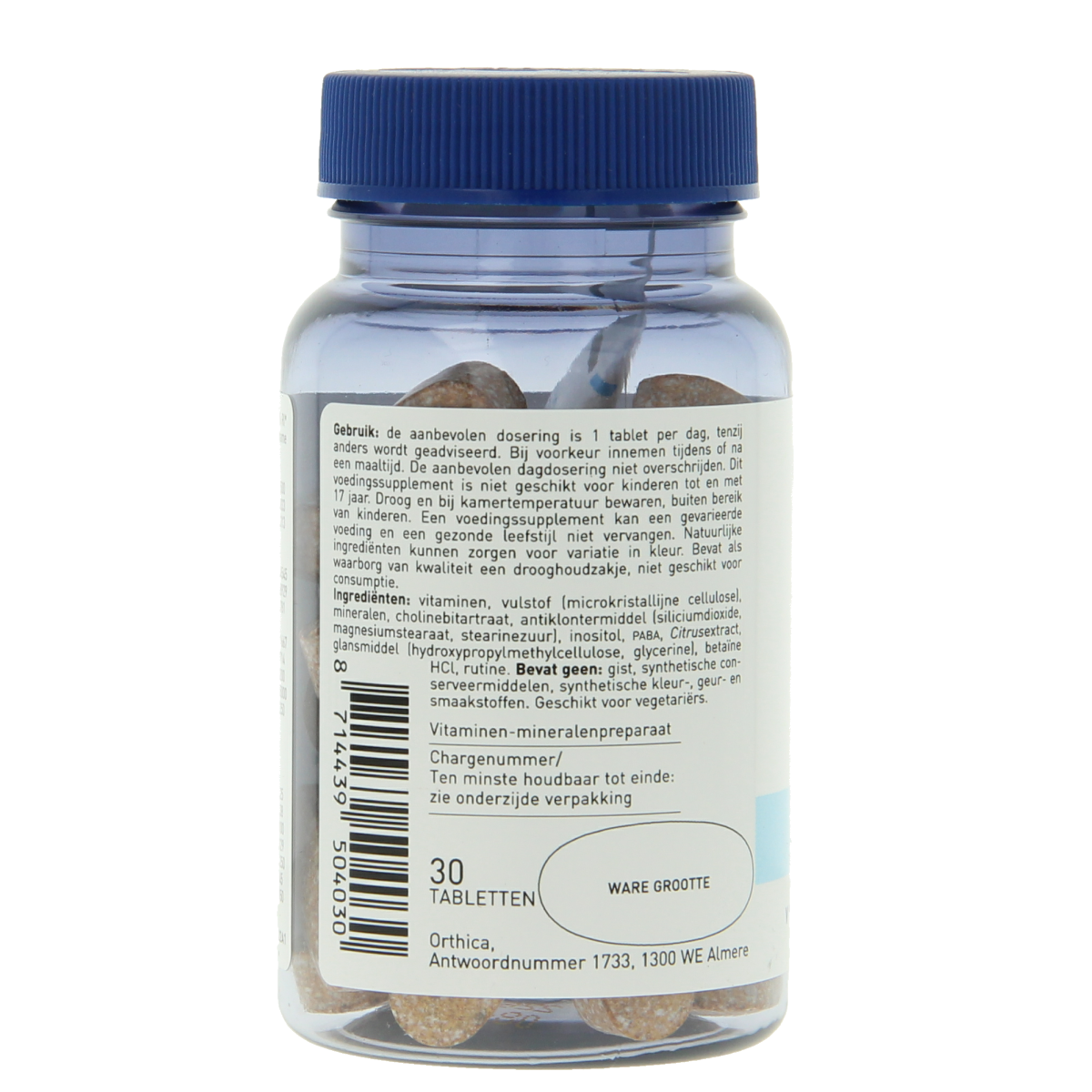 Vitaminen, vulstof (microkristallijne cellulose), mineralen, cholinebitartraat, antiklontermiddel (siliciumdioxide, magnesiumstearaat, stearinezuur), inositol, PABA, citrusextract, glansmiddel (hydroxypropylmethylcellulose, glycerine), betaïne HCl, rutine.