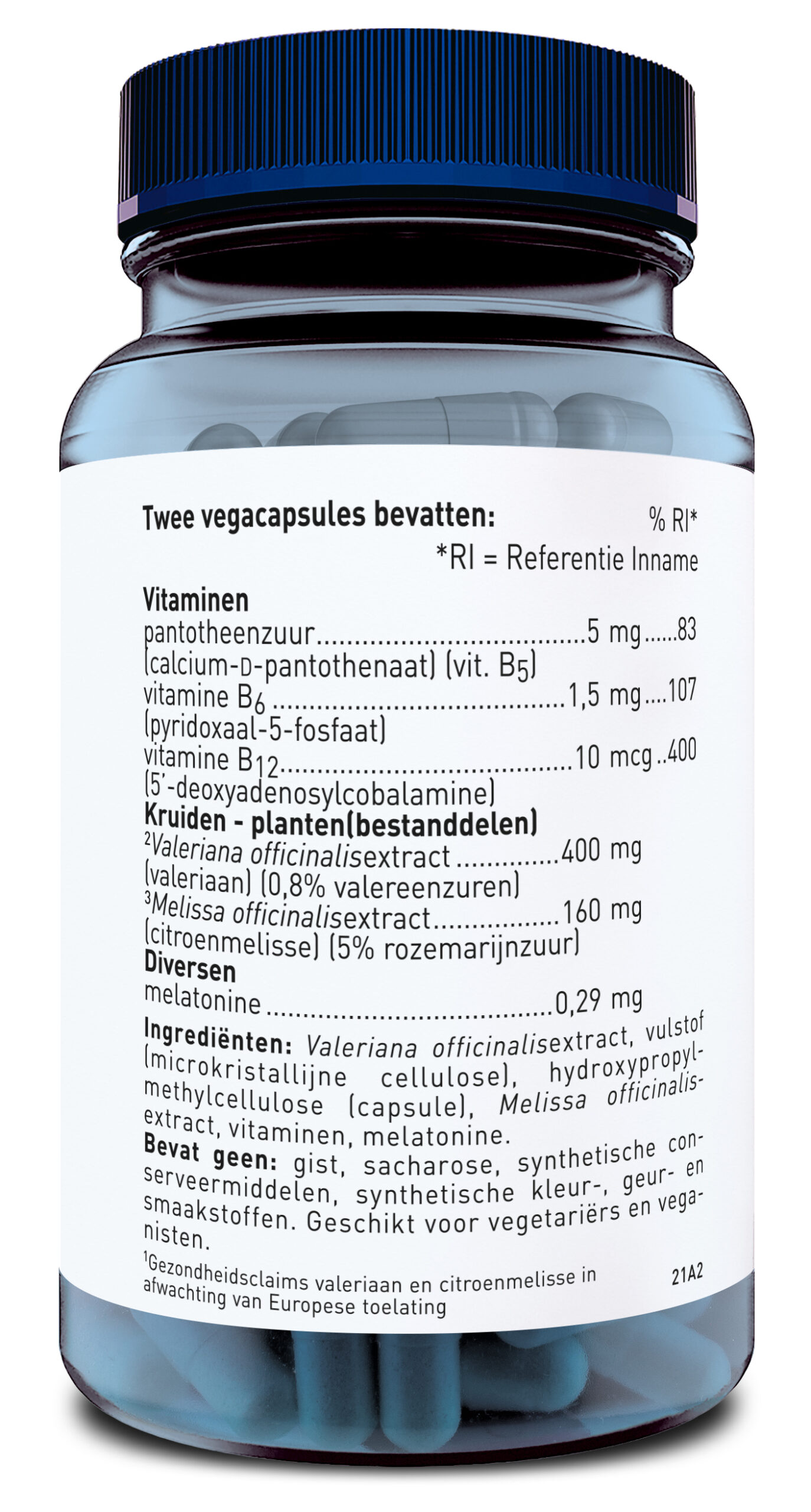 Valeriana officinalis extract, vulstof (microkristallijne cellulose), hydroxypropylmethylcellulose (capsule), Melissa officinalis extract, vitaminen, melatonine.