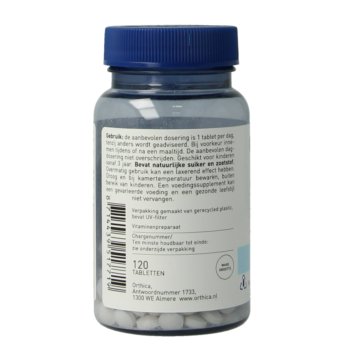 De aanbevolen dosering is 1 tablet per dag, tenzij anders wordt geadviseerd. Bij voorkeur innemen tijdens of na een maaltijd. Geschikt voor kinderen vanaf 3 jaar. Bevat natuurlijke suiker en zoetstof. Overmatig gebruik kan een laxerend effect hebben.