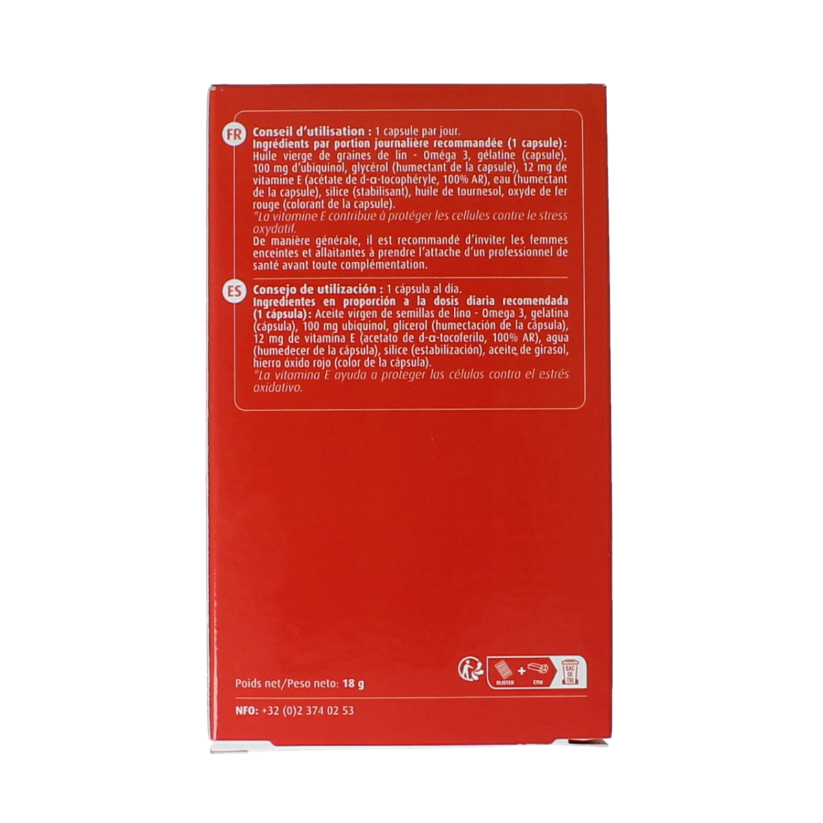 Lijnzaadolie van eerste persin, omega 3 (vulmiddel), gelatine (capsule), Ubiquinol, Glycerol (bevochtigingsmiddel), Colloidaal siliciumdioxide (stabilisator), rood ijzeroxide (kleurstof capsule)