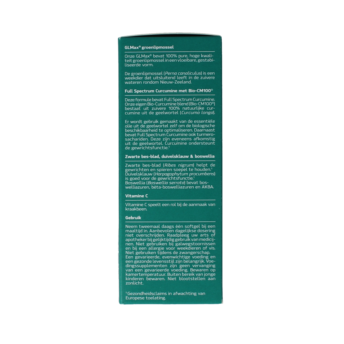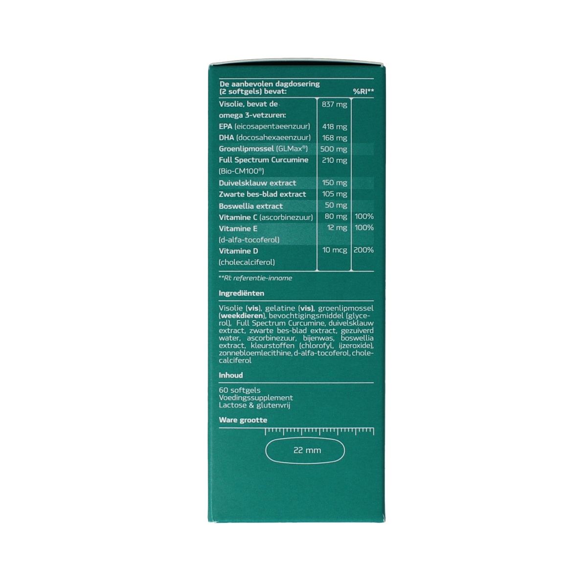 Visolie (VIS), capsule: gelatine (VIS), bevochtigingsmiddel (glycerol), gezuiverd water, kleurstof (kopercomplexen van chlorofyllen, ijzeroxide), groenlipmossel (WEEKDIER), duivelsklauw, bio-curcumine blend, zwarte besblad extract, Boswellin®, TurmXtra®, ascorbinezuur, stabilisator (bijenwas, lecithinen), d-alfa-tocoferol, cholecalciferol.