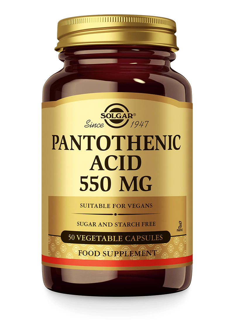 Solgar Pantothenic Acid 550 mg (Vitamine B-5, pantotheenzuur) draagt bij aan de normale weerstand tegen stress en helpt bij vermoeidheid.