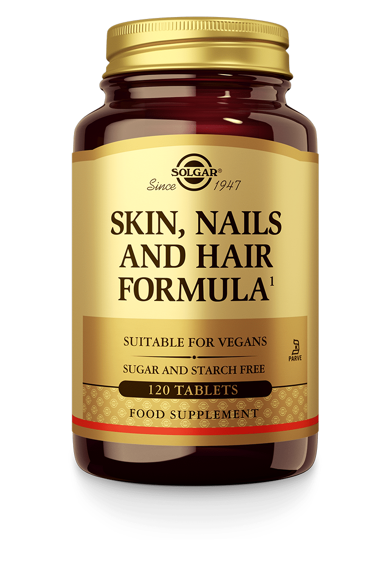 Solgar Skin, Nails and Hair Formula helpt bij de verzorging van de huid van binnenuit (vitamine C), houdt het haar sterk en is goed voor de nagels (zink).