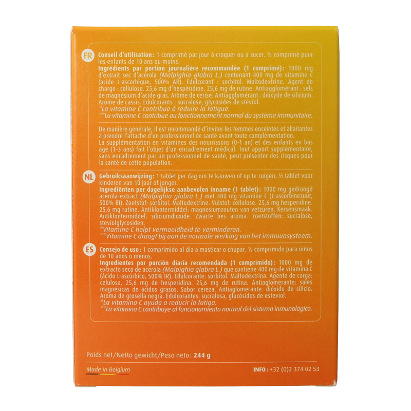 Gedroogd acerola extract (malpighia glabra L) met vitamine C (L-ascorbinezuur), Zoetstof: sorbitol, Maltodextrine, Vulstof: cellulose, Hesperidine, Rutine, Antiklontermiddel: magnesiumzouten van vetzuren, Kersensmaak, Antiklontermiddel: siliciumdioxide, Zwarte bes aroma, Zoetstoffen: sucralose, steviolglucosiden