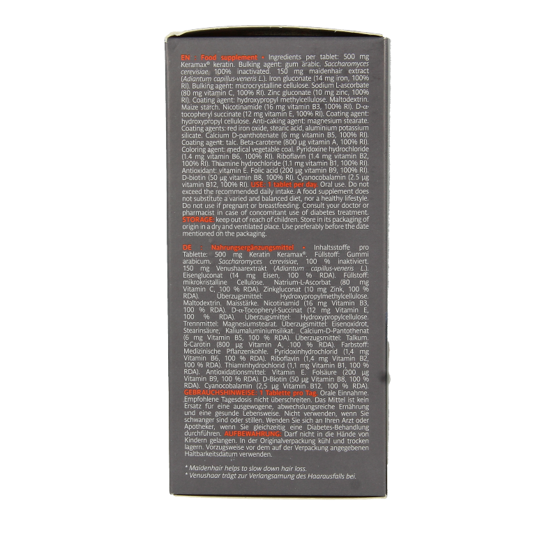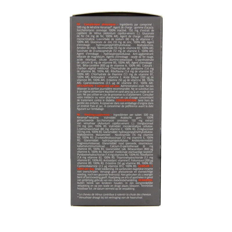 Keramax® keratine, vulmiddel: Arabische gom, 100% geinactiveerde saccharomyces ceriviciae, Extract van venushaar (adiantum capillus veneris L), IJzergluconaat, Vulmiddel: microkristallijne cellulose, L-natriumascorbaat (vitamine C), Zinkgluconaat (zink), Glansmiddel: hydroxypropylmethylcellulose, Maltodextrine, Maiszetmeel, Nicotinamide (Vitamine B3), D-alfa-tocoferylsuccinaat (vitamine E), Glansmiddel: hydroxypropylcellulose, Antiklontermiddel: magnesiumstearaat, Glansmiddel: rood ijzeroxide, stearinezuur, kaliummalaluminiumsilicaat, Calcium-d-pantothenaat (vitamine B5), Glansmiddel: talk, Betacaroteen (vitamine A), Kleurstof: medicinale plantaardige koolstof, Pyridoxinehydrochloride (vitamine B6), Riboflavine (vitamine B2), Thiaminehydrochloride (vitamine B1), Antioxidant: vitamine E, Foliumzuur (vitamine B9), D-biotine (vitamine B8), Cyanocobalamine (vitamne B12)