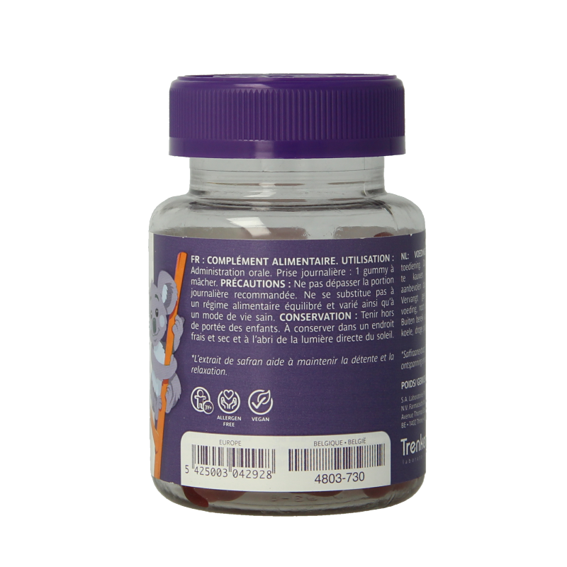Vulstof: maltitol, Geleermiddel: pectin, saffraanextract (Crocus sativus L.), Maltodextrine, Zuurmiddel: citroenzuur, Water, Natuurlijk rodevruchtenaroma, Zuurmiddel: natriumcitraat, Wortelconcentraat (Daucus carota L.), Zwarte besconcentraat (Ribes nigrum L.), Kokosolie, Glansmiddel: carnaubawas, Antioxidant: alfatocoferol.