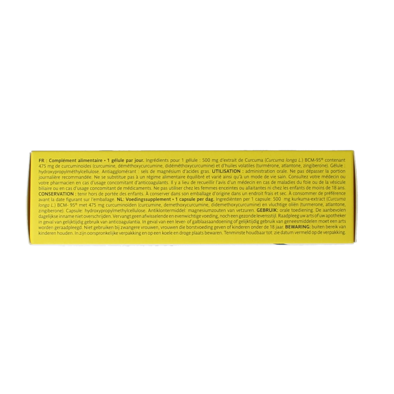 Kurkuma-extract (Curcuma longa L.) BCM-95® met kurkuminoïden (kurkumine, demethoxykurkumine, didemethoxykurkumine) en vluchtige oliën (tumerone, atlantone, zingiberone), Capsule: hypromellose, Antiklontermiddel: magnesiumstearaat
