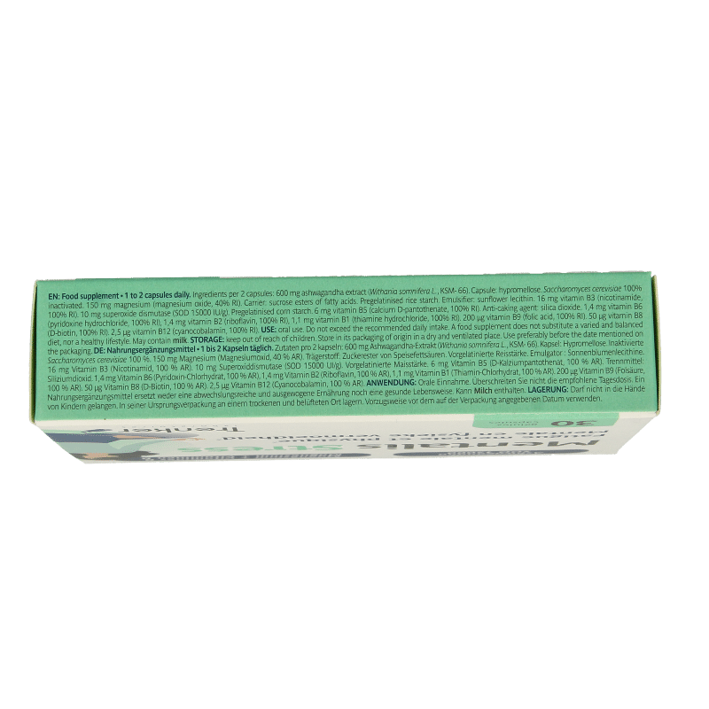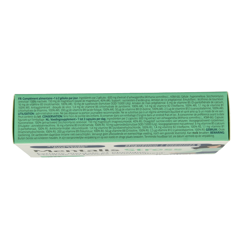 Extract van ashwagandha (Withania somnifera L., KSM-66), Capsule: hypromellose. Geïnactiveerd Saccharomyces cerevisiae, Magnesium (magnesiumoxide), Draagstof: sucrose-esters van vetzuren, voorgegelatineerd rijstzetmeel, emulgator: zonnebloemlecithine, Vitamine B3 (nicotinamide) Superoxidedismutate (SOD), Voorgegelatineerd maiszetmeel, Vitamine B5 (calcium d-pantothenaat), Antiklontermiddel (siliciumdioxide), Vitamine B6 (pyridoxinehydrochloride), Vitamine B2 (riboflavine), Vitamine B1 (thiaminehydrochloride), Vitamine B9 (foliumzuur), Vitamine B8 (d-biotine), Vitamine B12 (cyanocobalamine)