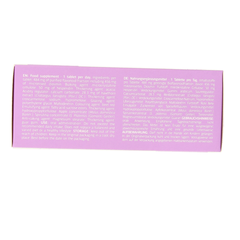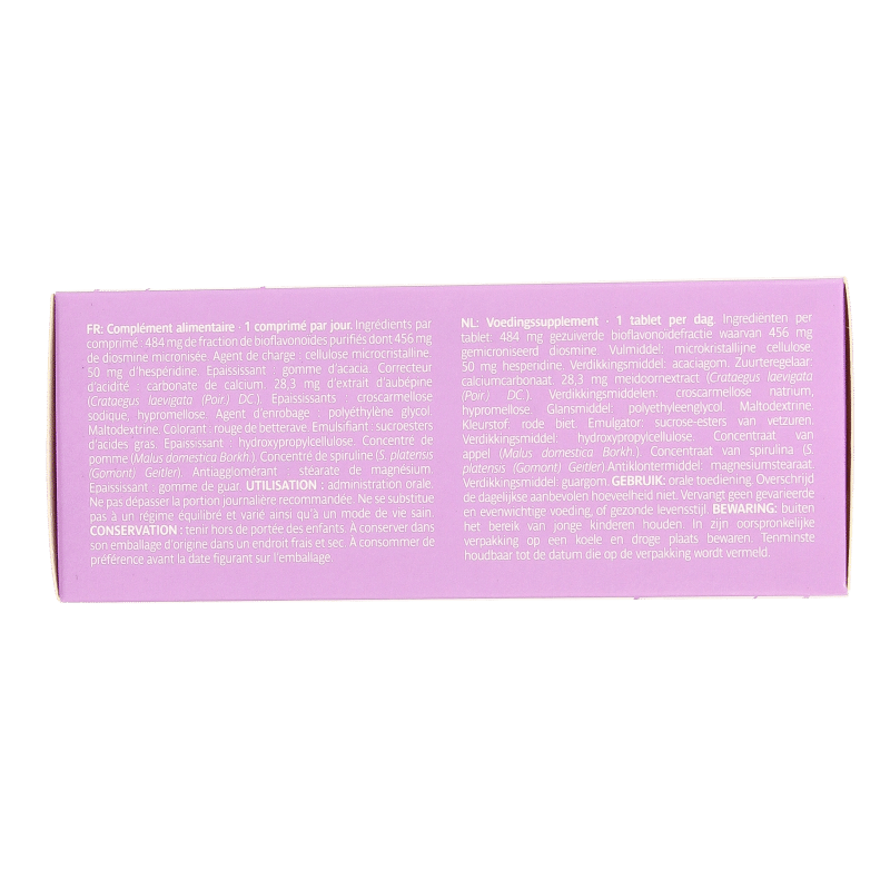 Gezuiverde bioflavonoïdefractiem gemicroniseerd diosminem, vulmiddel: microkristallijne cellulose, hesperidine, verdikkingsmiddel: acaciagom, zuurteregelaar: calciumcarbonaat, meidoornextract (Crataegus laevigata