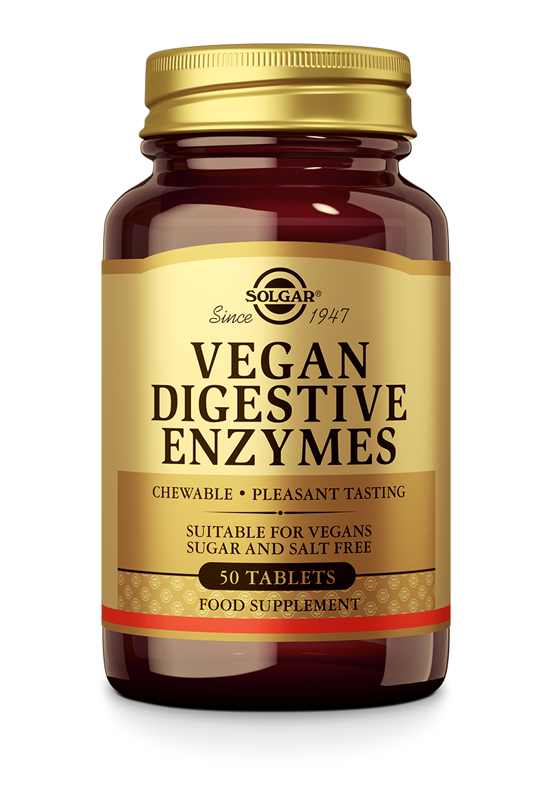 Solgar Vegan Digestive Enzymes bevat koolhydraat-, eiwit-, en vetsplitsende enzymen.