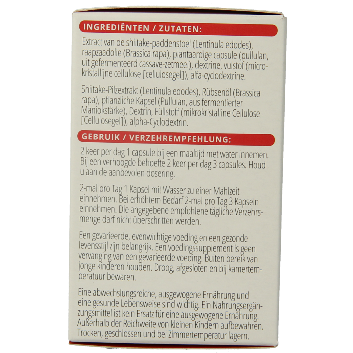 Extract van de shiitake-paddenstoel (lentinula edodes), raapzaadolie (brassica rapa), plantaardige capsule (pullulan, uit gefermenteerde cassave-zetmeel), dextrine, vulstof (microkristallijne cellulose (cellulosegel), alfa-cyclodextrine