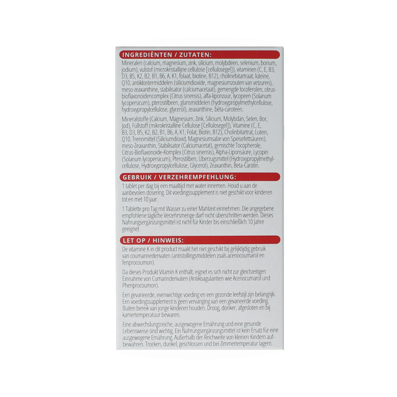 Mineralen (calcium, magnesium, zink, silicium, molybdeen, selenium, borium, jodium), vulstof (microkristallijne cellulose [cellulosegel]), vitaminen (C, E, B3, D3, B5, K2, B2, B1, B6, A, K1, folaat, biotine, B12), cholinebitartraat, luteïne, Q10, antiklontermiddelen (siliciumdioxide, magnesiumzouten van vetzuren), meso-zeaxanthine, stabilisator (calciumacetaat), gemengde tocoferolen, citrusbioflavonoïdencomplex (Citrus sinensis), alfa-liponzuur, lycopeen (Solanum lycopersicum), pterostilbeen, glansmiddelen (hydroxypropylmethylcellulose, hydroxypropylcellulose, glycerol), zeaxanthine, bèta-caroteen.
