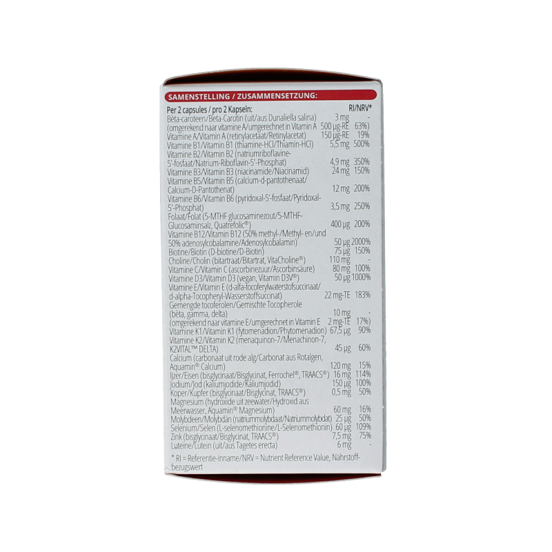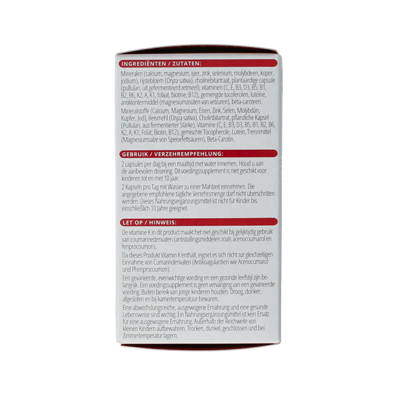 Mineralen (calcium, magnesium, ijzer, zink, selenium, molybdeen, koper, jodium), rijstebloem (Oryza sativa), cholinebitartraat, plantaardige capsule (pullulan, uit gefermenteerd zetmeel), vitaminen (C, E, B3, D3, B5, B1, B2, B6, K2, A, K1, folaat, biotine, B12), gemengde tocoferolen, luteïne, antiklontermiddel (magnesiumzouten van vetzuren), bèta-caroteen.