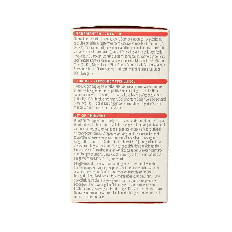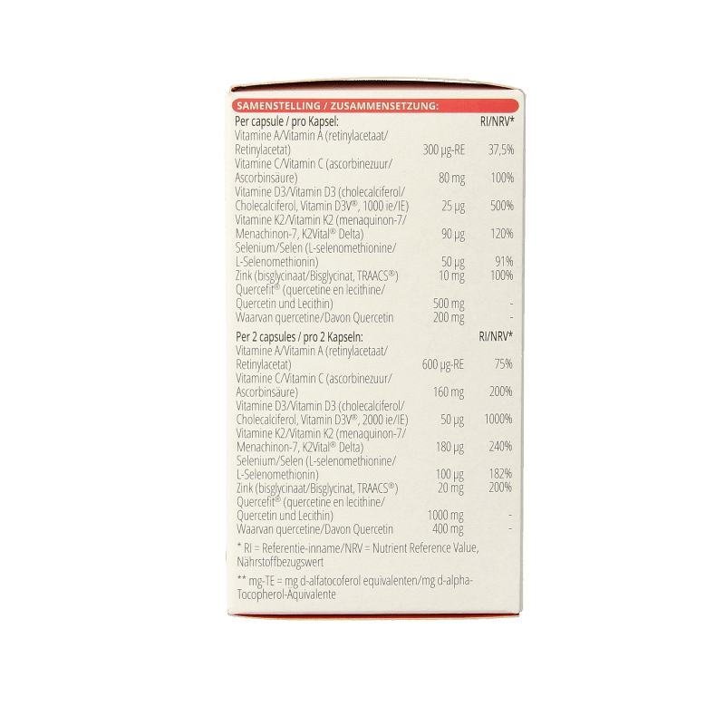 Quercetine (extract uit honingboom, Sophora japonica, bloem), plantaardige capsule (pullulan, uit gefermenteerd cassave-zetmeel), vitaminen (C, A, D3, K2), vulstof (microkristallijne cellulose [cellulosegel]), mineralen (zink, selenium), antiklontermiddelen (calciumzouten van vetzuren, siliciumdioxide).