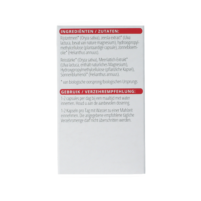 Rijstzetmeel** (Oryza sativa), zeesla-extract** (Ulva lactuca, bevat van nature magnesium), hydroxypropylmethylcellulose (plantaardige capsule), zonnebloemolie** (Helianthus annuus).