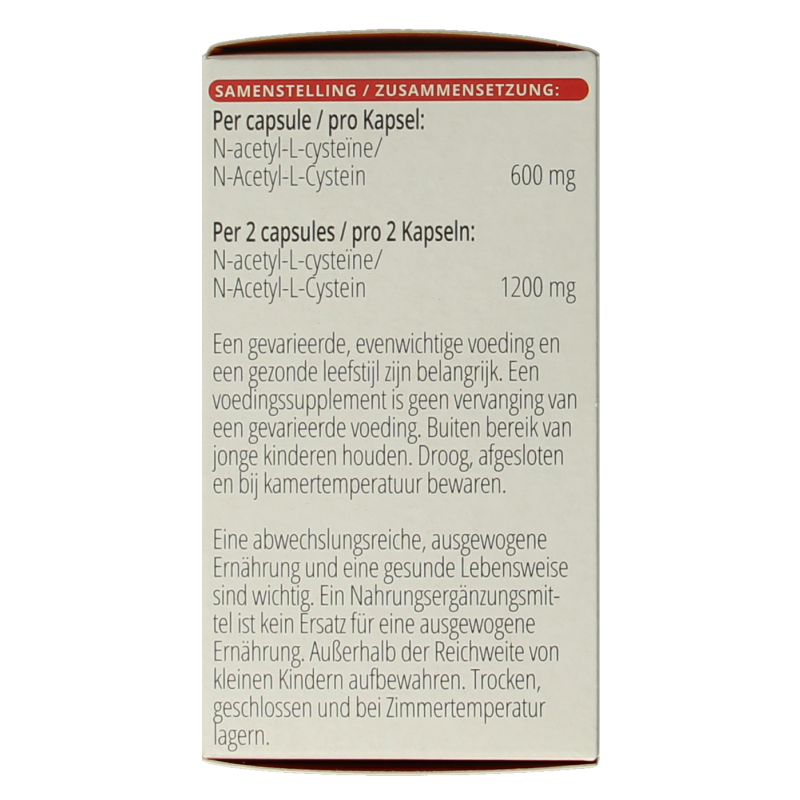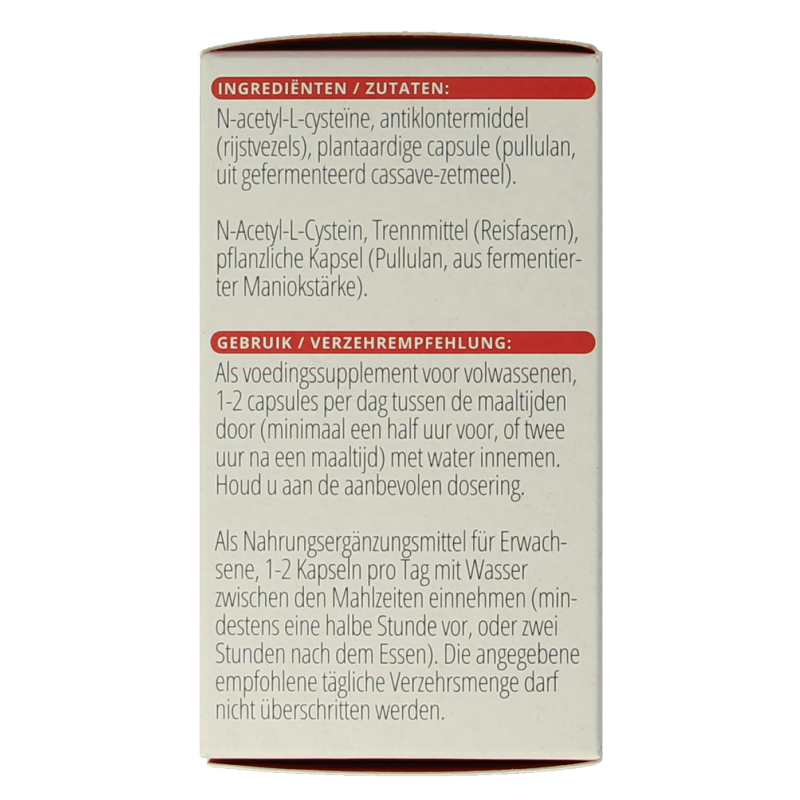 N-acetyl-L-cysteïne, antiklontermiddel (rijstvezels), plantaardige capsule (pullulan, uit gefermenteerd cassave-zetmeel).