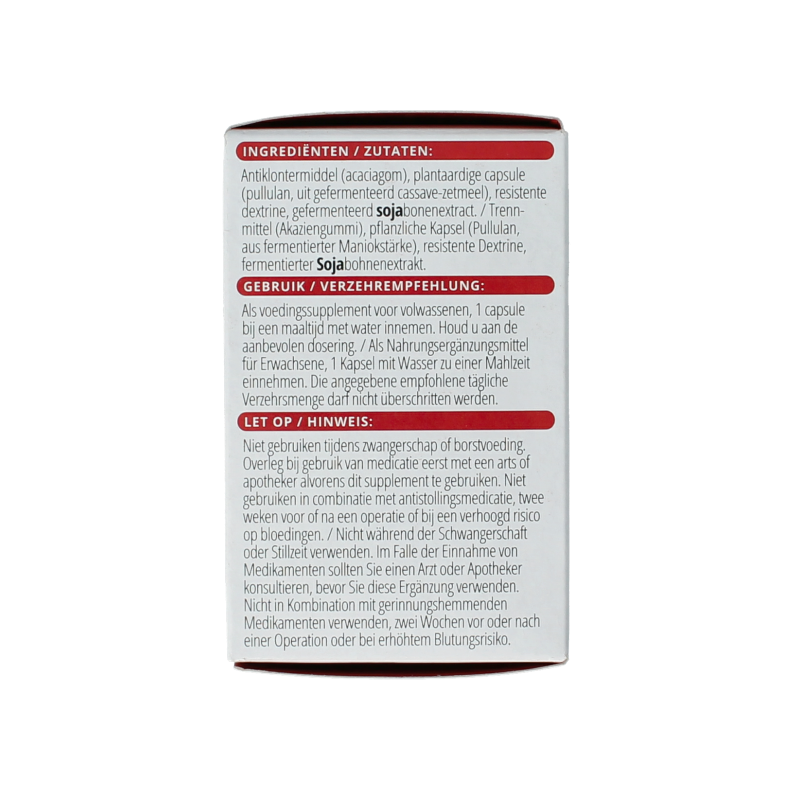 Antiklontermiddel (acaciagom), plantaardige capsule (pullulan, uit gefermenteerd cassave-zetmeel), resistente dextrine, gefermenteerd SOJAbonenextract.
