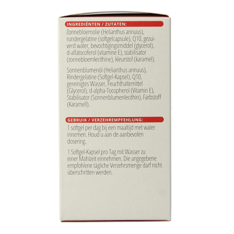 MCT olie, rundergelatine (softgelcapsule), Q10, bevochtigingsmiddelen (glycerol, sorbitol), stabilisatoren (bijenwas, zonnebloemlecithine), d-alfatocoferol (vitamine E), gezuiverd water, kleurstof (karamel).