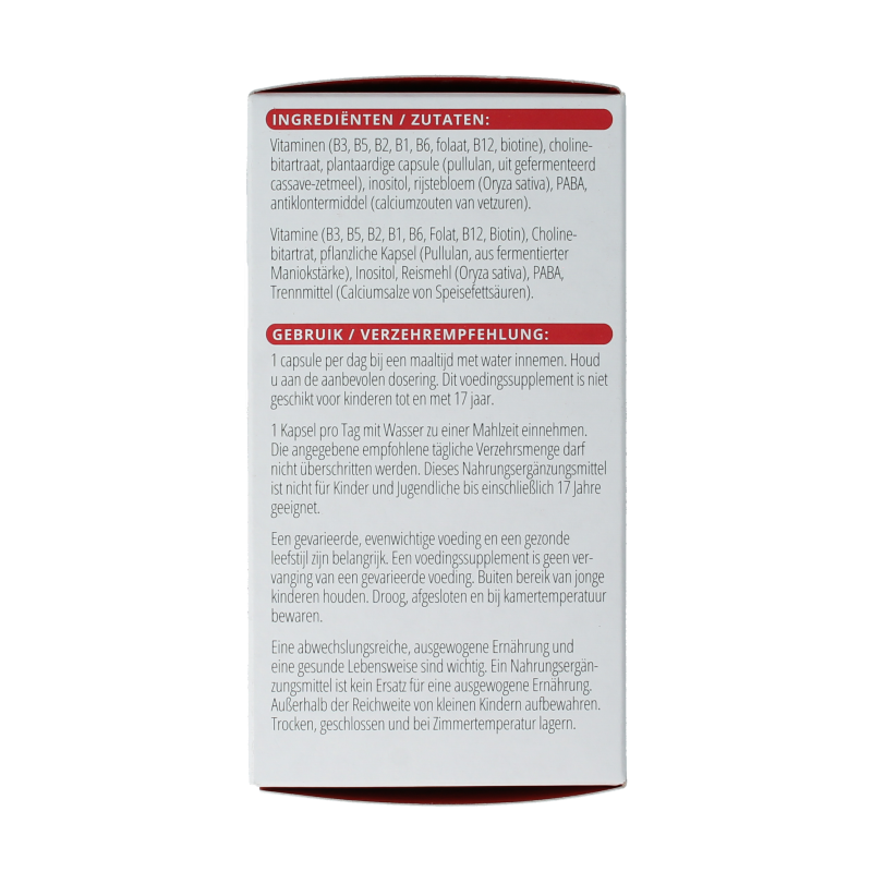 Vitaminen (B3, B5, B2, B1, B6, folaat, B12, biotine), cholinebitartraat, plantaardige capsule (pullulan, uit gefermenteerd cassave-zetmeel), inositol, rijstebloem (Oryza sativa), PABA, antiklontermiddel (calciumzouten van vetzuren).