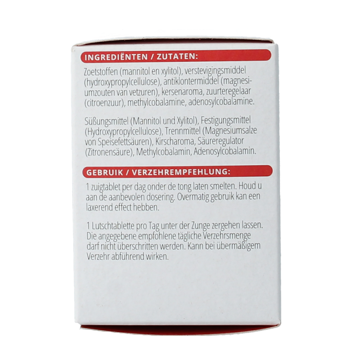 Zoetstoffen (mannitol en xylitol), verstevigingsmiddel (hydroxypropylcellulose), antiklontermiddel (magnesiumzouten van vetzuren), kersenaroma, zuurteregelaar (citroenzuur), methylcobalamine, adenosylcobalamine.