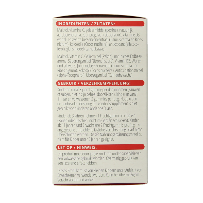 Kinderen vanaf 3 jaar 1 gummy per dag innemen kauwen of zuigen, niet in zijn geheel doorslikken), kinderen vanaf 11 jaar en volwassenen 2 gummies per dag. Houd u aan de aanbevolen dosering. Dit voedingssupplement is niet geschikt voor kinderen onder de 3 jaar. Overmatig gebruik kan een laxerend effect hebben.