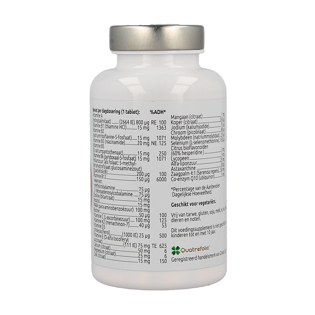 Vitamine A (retinylpalmitaat) (2664 IE), Vitamine B1 (thiamine HCl), Vitamine B2 (natriumriboflavine-5-fosfaat), Vitamine B3 (niacinamide), Vitamine B5 (D-calciumpantothenaat), Vitamine B6 (pyridoxaal-5-fosfaat), Foliumzuur (als folaat: 5-methyl-tetrahydrofolaat glucosaminezout) (Quatrefolic®), Vitamine B12, Biotine, Vitamine C (L-ascorbinezuur), Vitamine K2 (menachinon-7), Vitamine D3 (cholecalciferol) 1000 IE, Vitamine E (D-alfa tocoferyl succinaat) 1111IE, Calcium (citraat), Magnesium (citraat), Zink (citraat), Mangaan (citraat), Koper (gluconaat), Jodium (kaliumjodide), Chroom (picolinaat), Molybdeen (natriummolybdaat), Selenium (L-selenomethionine), Citrus bioflavonoïden (60% hesperidine), Lycopeen, Astaxanthine, Zaagpalm (Serenoa repens) extract (4:1), Vulstoffen (Microkristallijne cellulose, Calciumcarbonaat), PABA, Choline, Inositol, Antiklontermiddel (Siliciumdioxide), Coating (Hydroxypropylmethylcellulose), Alfa-liponzuur, Carotenoïden, Bioflavonoïden, Co-enzym.
